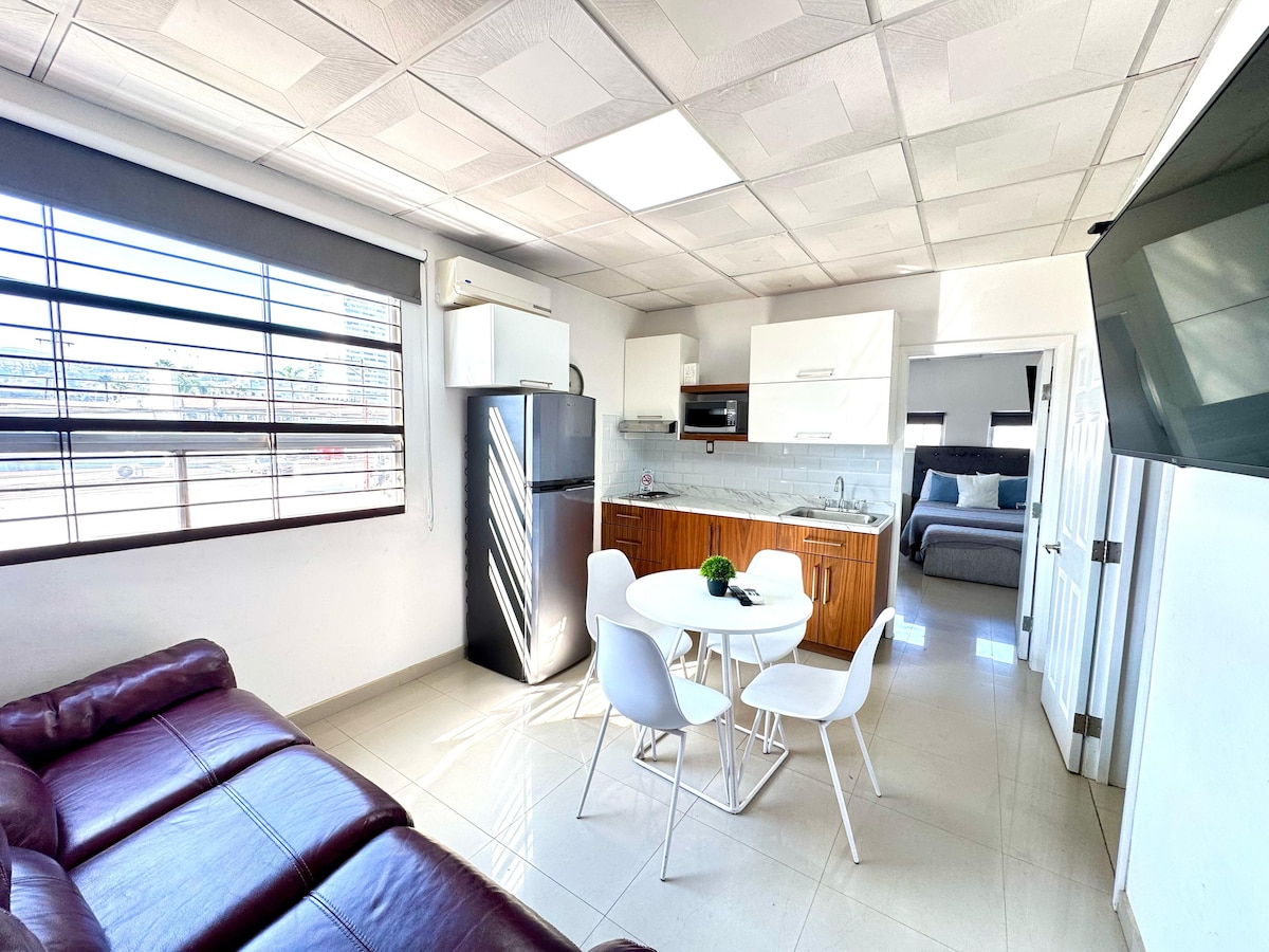 Disfruta la comodidad de este alojamiento Nuevo, tranquilo y muy céntrico. Estupenda vista y magnifica ubicación a solo 5 minutos de la frontera México-USA. A tan solo unas calles de la vibrante Av.Revolución. A pocos pasos de restaurantes, vida nocturna y consultorios médicos. Cuenta con 1 recámara (1 cama Queen + colchón inflable), 1 Tv 50” con aplicaciones: HBO, Netflix, MLB. Utensilios de cocina, lavadora, secadora y plancha para ropa, secadora de cabello. Parking gratuito con seguridad 24/7