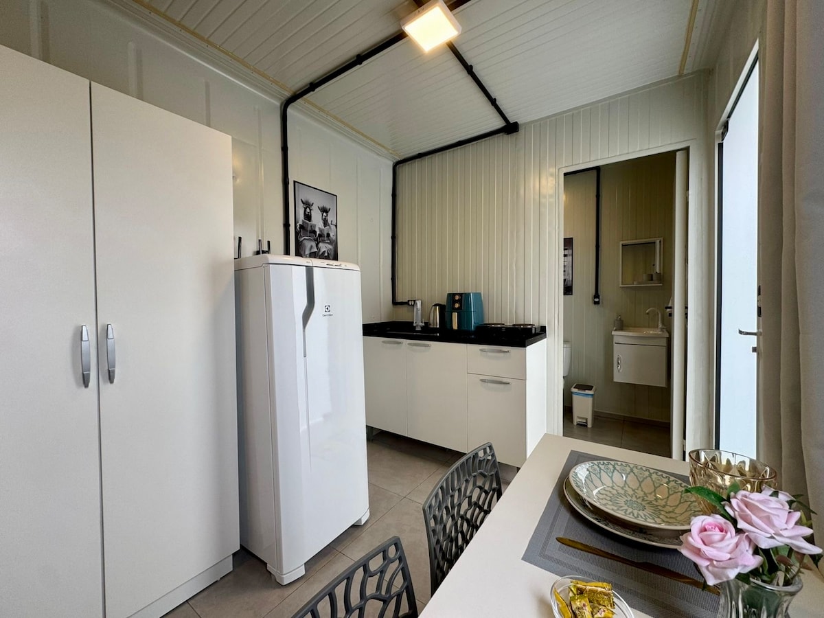 Casa Container charmosa e moderna, perfeita para uma estadia tranquila e confortável. Móveis novos e bem equipados: TV de 32" com fire Stick tv, ar-condicionado split silencioso, cama de casal com colchão de molas ensacadas, roupeiro, geladeira, fogão elétrico, chuveiro elétrico e secador de cabelo. Espaço pensado com carinho para garantir o seu bem-estar. Pátio amplo com sons da natureza, em localização urbana privilegiada. Venha relaxar e se sentir em casa! 😁