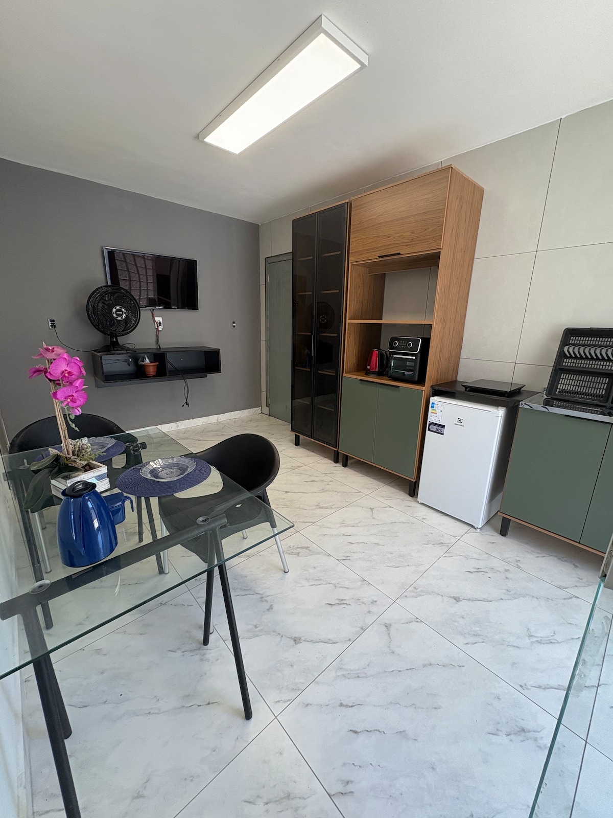 Aconchegante apartamento térreo com entrada privativa! Nossa casa é dividida em 4 unidades independentes, cada uma com total privacidade e comodidade. Este apto conta com: Ar-condicionado, TV Cozinha com fogão elétrico de 2 bocas, geladeira e utensílios básicos Mesa de jantar para 2 pessoas Dois colchões de solteiro (podem ser unidos p/ formar cama de casal) + cama auxiliar Banheiro privativo com chuveiro elétrico Ideal para quem busca um espaço prático, confortável e bem equipado para descansar