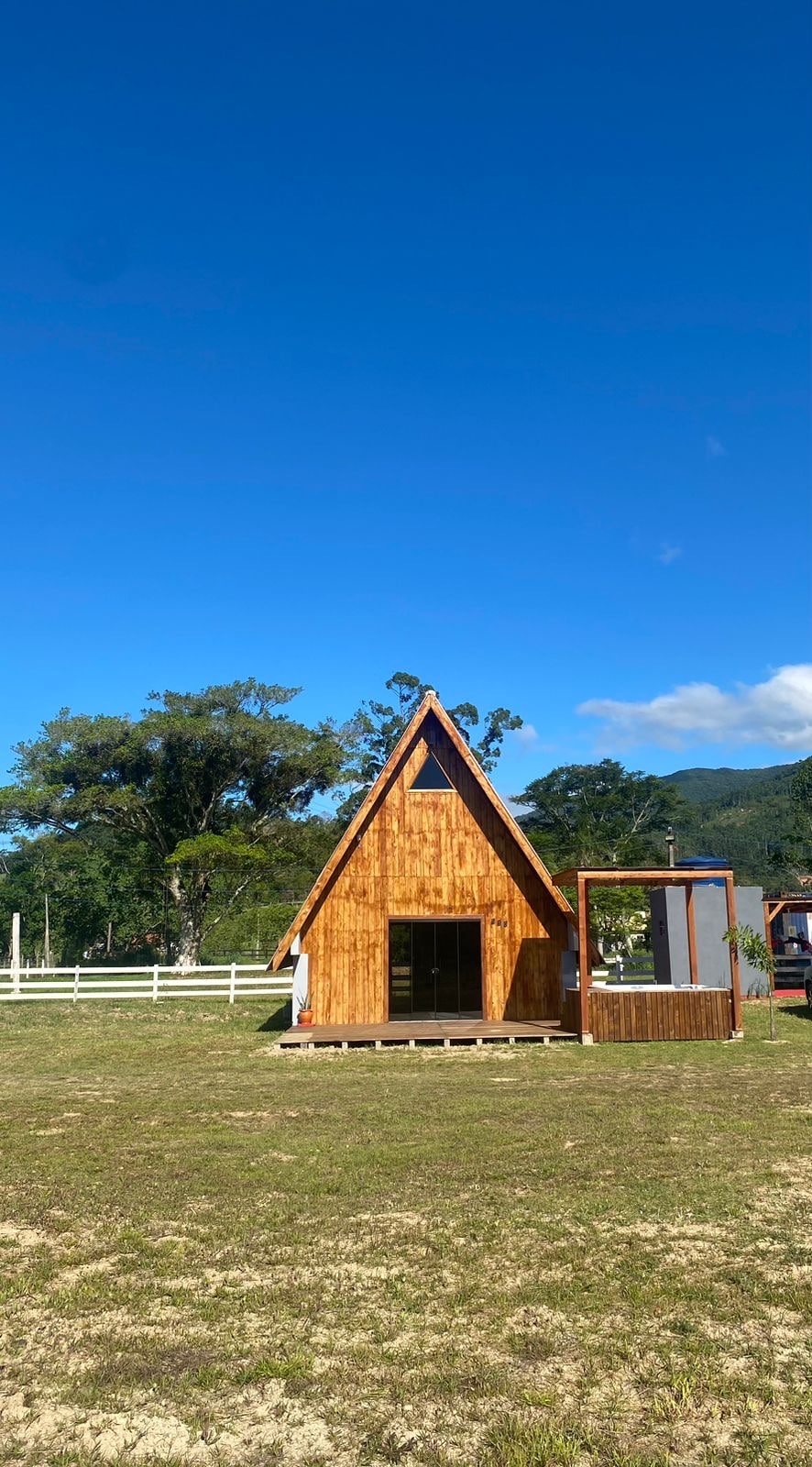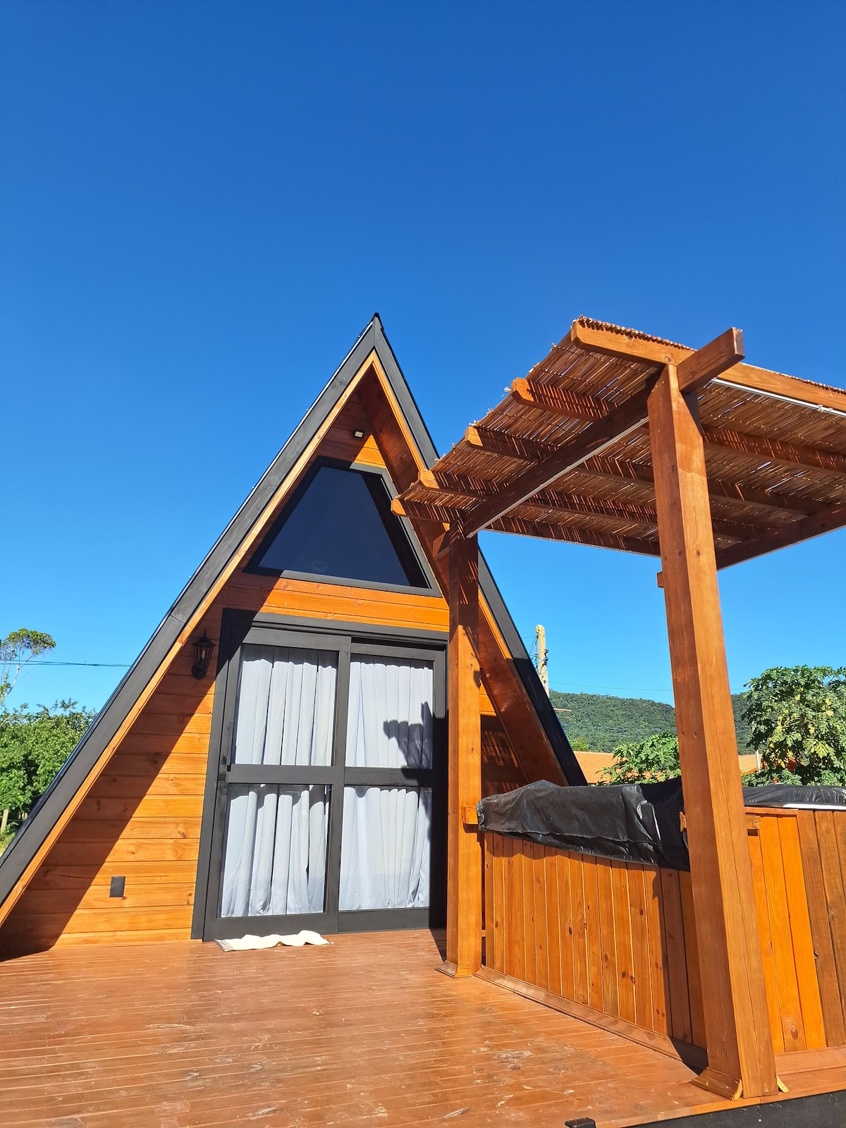 A acomodação se destaca por ser uma cabana de madeira em estilo chalé moderno, com arquitetura charmosa em formato A-frame, que traz aconchego e ao mesmo tempo sofisticação. Ela está localizada em um ambiente amplo, verde e tranquilo, perfeita para quem busca descanso, contato com a natureza e privacidade. Outro ponto especial é o espaço externo exclusivo, ideal para relaxar, curtir o ar livre, tomar chimarrão, fazer um churrasco ou aproveitar o sol com vista para o campo e as montanhas.