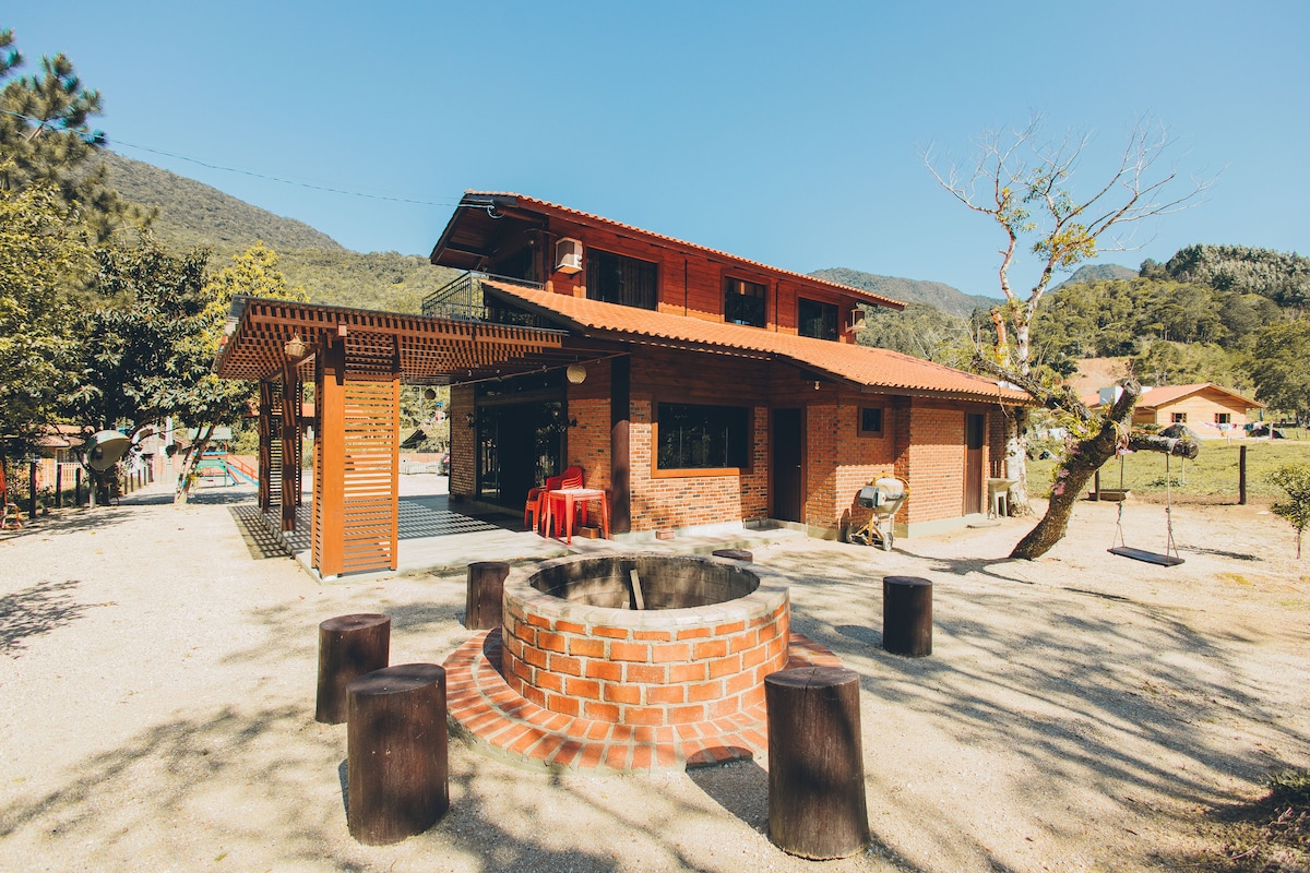 Relaxe com toda a família neste lugar único e tranquilo , onde você pode acordar integrado a natureza, ouvindo os pássaros. Uma casa completa e aconchegante, com lareira interna, 4 quartos , sendo 3 suites voltadas para o lago, quadra de beach tenis,piscina,Roda de Fogo, sala de Jogos c/Pebolin, Ping Pong, Aero Rockey . Jacuzzi, Mesa de Sinuca integrada a sala de jantar e estar. Churrasqueira, fogão e forno a lenha....enfim , um lugar incrível, com uma casa toda conectada a natureza e você!!