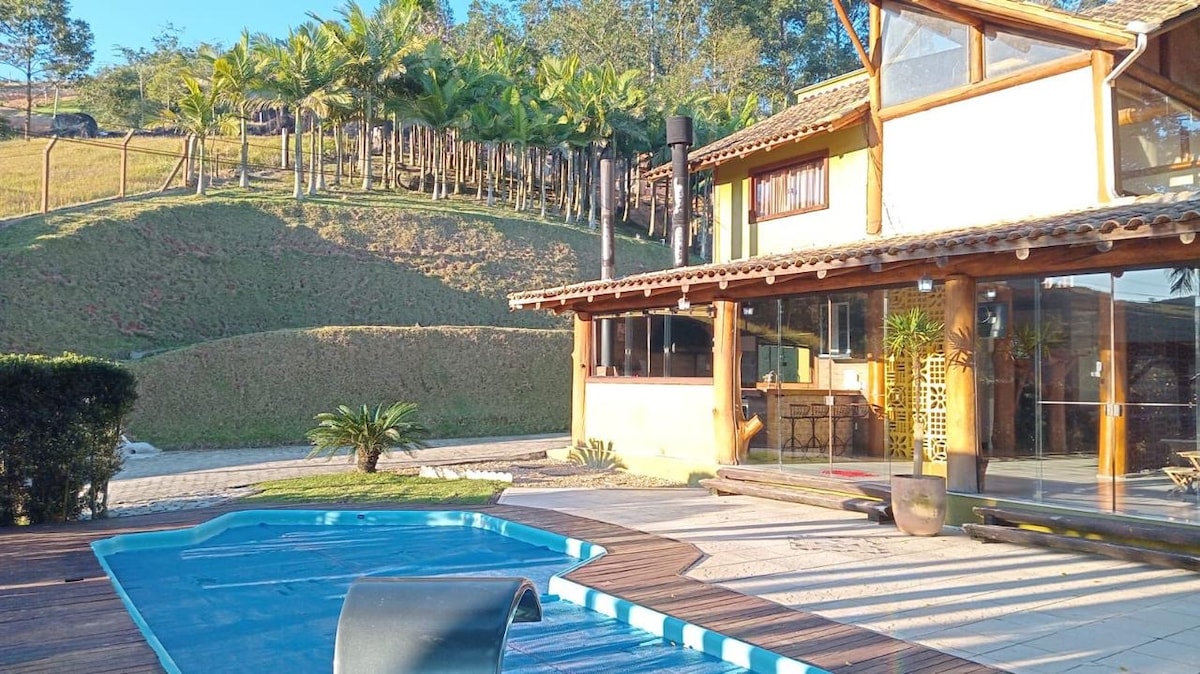 Sítio encantador com 3 suítes, espaço com churrasqueira, cozinha completa equipada com todos utensílios, piscina aquecida, jacuzzi, lago podendo até pescar. Reconecte-se à natureza neste lugar inesquecível, lugar silencioso e próximo a belas praias de Santa Catarina. Um total de 2 hectares de área para você aproveitar ao máximo, temos patos no lago, pedimos apenas que não maltratem. Se houver disponibilidade podemos flexibilizar o checkin e o checkout.