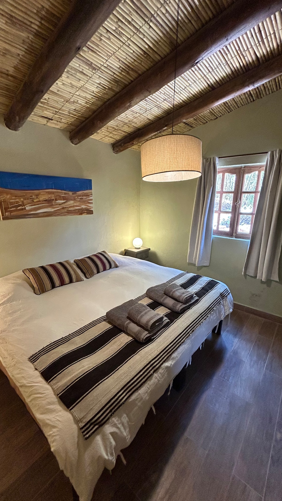 Ranch for 2 people in a 4000 square meter property, with an incredible view of the mountains of the Paleta del Pintor, in the middle of a field of crops and a corral of llamas, built in an Andean style, with local materials such as adobe, cane and stone, solar heating and efficient use of water.
