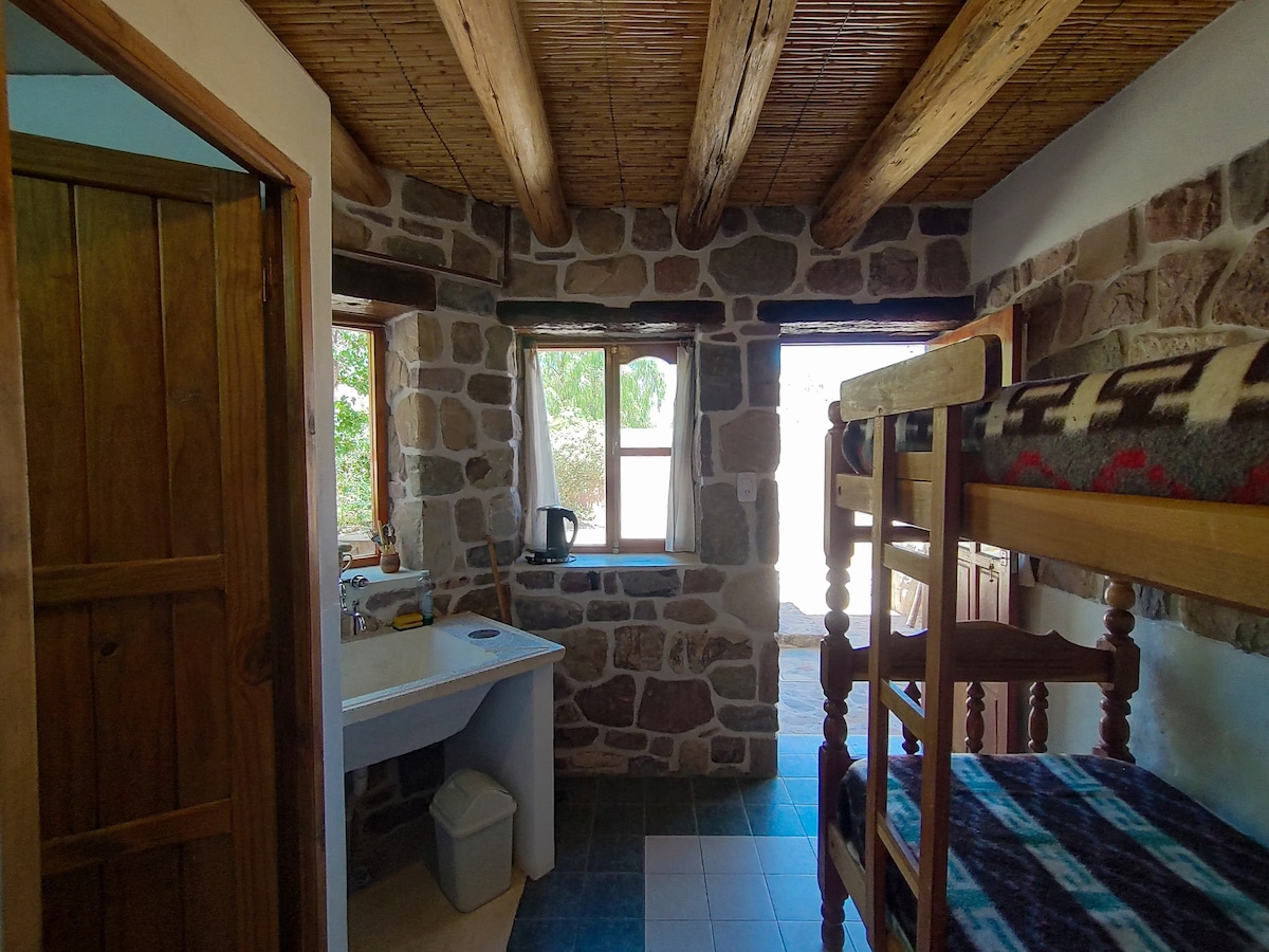 Es una cabaña amplia para cinco persona cuenta con una cama matrimonial y tres camas de una plaza y media con un baño con ducha agua caliente por termotanque solar una cocina pequeña una heladera bacha y una pileta pequeña para lavar ropa si lo desea en el dormitorio mas amplio se encuentra las camas de una plaza y en dormitorio mas pequeño la cama matrimonial donde también se encuentra una s ventanas amplia donde se puede ver el paisaje del pucara cuenta con un asador y una mesa