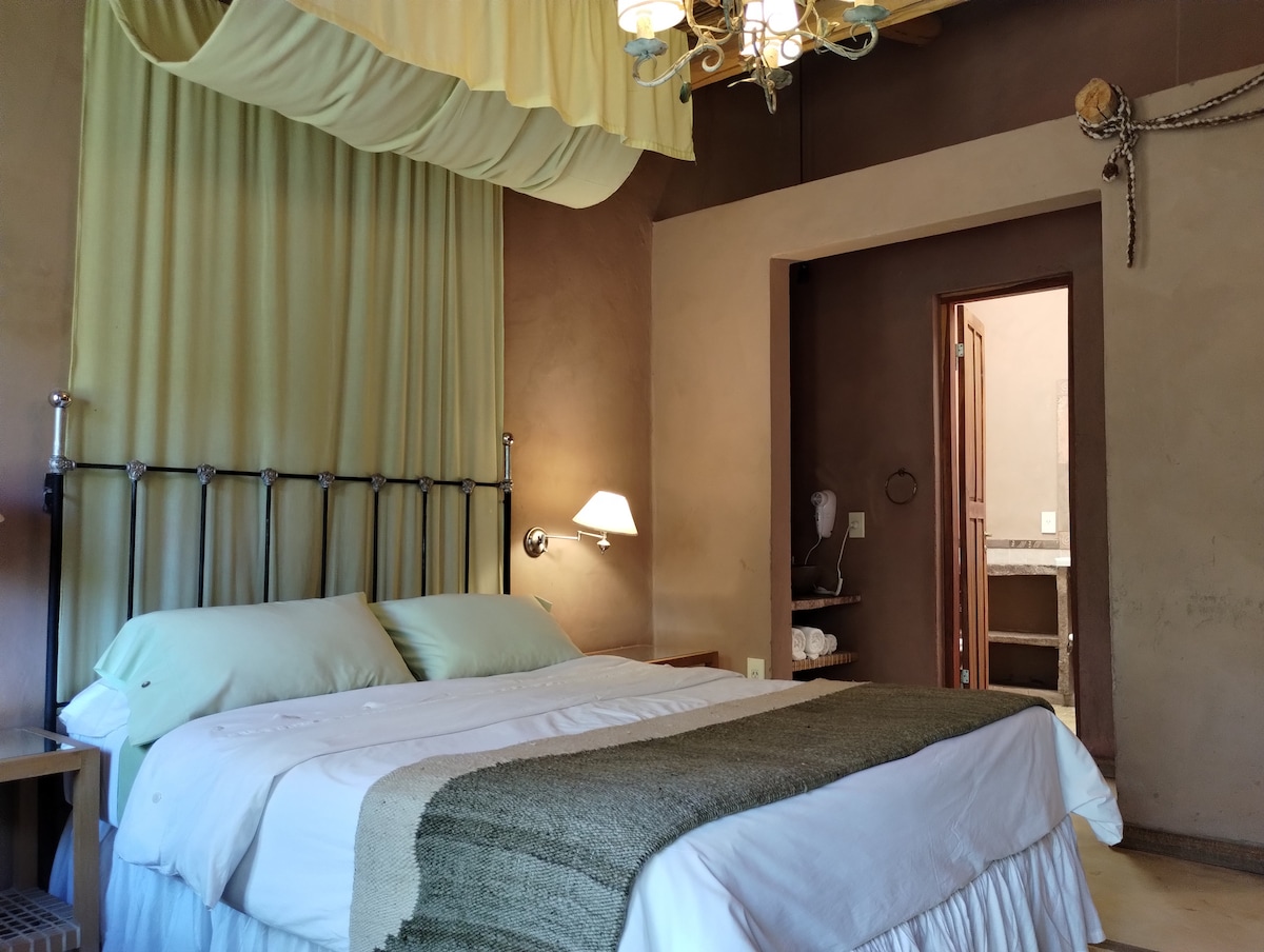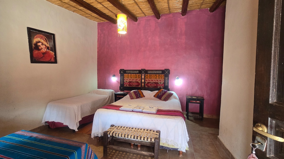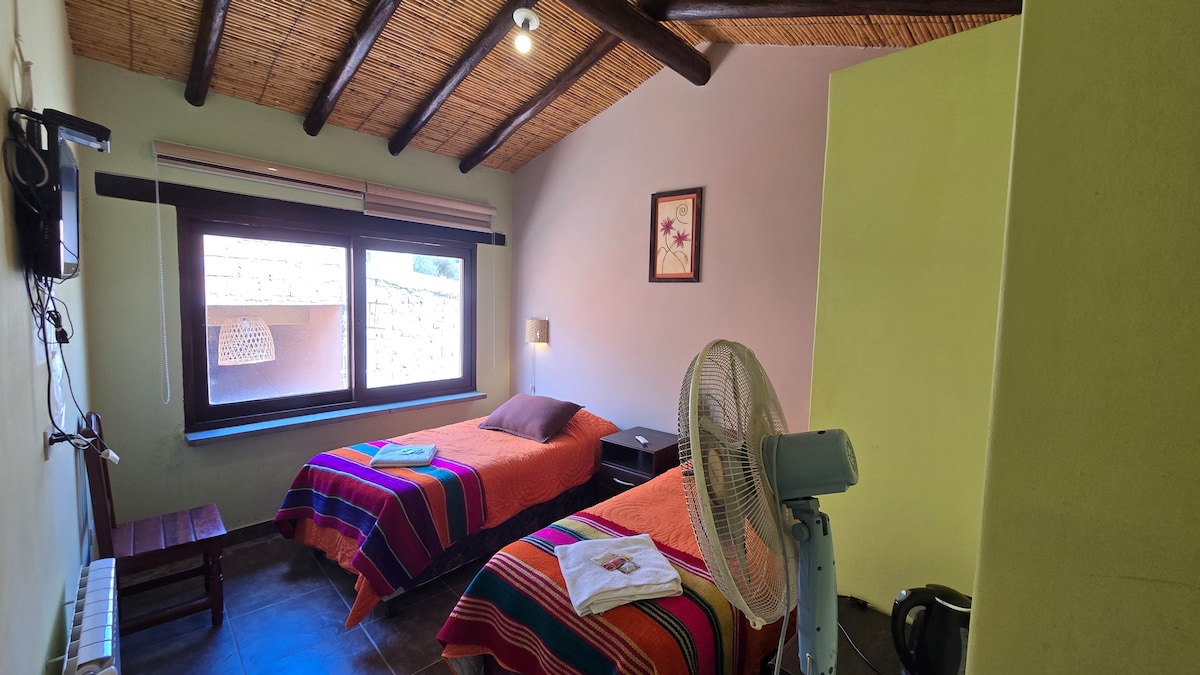 Esta encantadora habitación del Hotel CasaCalma cuenta con todo lo necesario para una estadía maravillosa. Servicio diario de limpieza, calefacción eléctrica y salamandra a leña, infusiones de cortesía en habitación, desayuno tipo buffet incluído, estacionamiento. La disposición de las camas pueden ser 3 singles o 1 doble y 1 single. Tiene terraza privada con reposeras y mesitas para disfrutar de los maravillosos paisajes de la Quebrada de Humahuaca. El hotel cuenta con bar y restaurante.