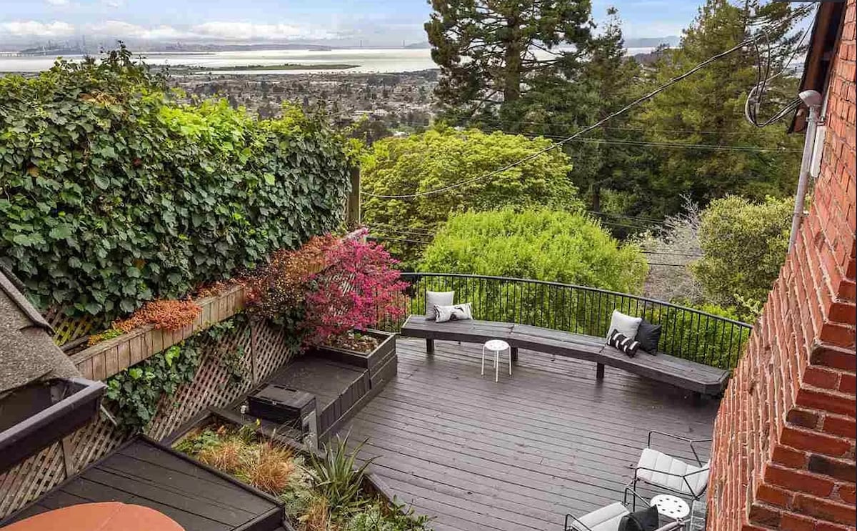 Located in the scenic, tranquil Berkeley Hills, just up the hill from UC Berkeley, this climate controlled studio offers spectacular views, privacy & a large outdoor dining area. You’ll enjoy huge windows overlooking the SF Bay, lots of natural light, a new queen bed, lounge area, bluetooth speaker & kitchenette with sink, fridge, microwave, coffee/tea station. A large monitor and standing desk makes it easy to work or stream movies using our gigabit Wi-Fi. Easy parking and bus access.