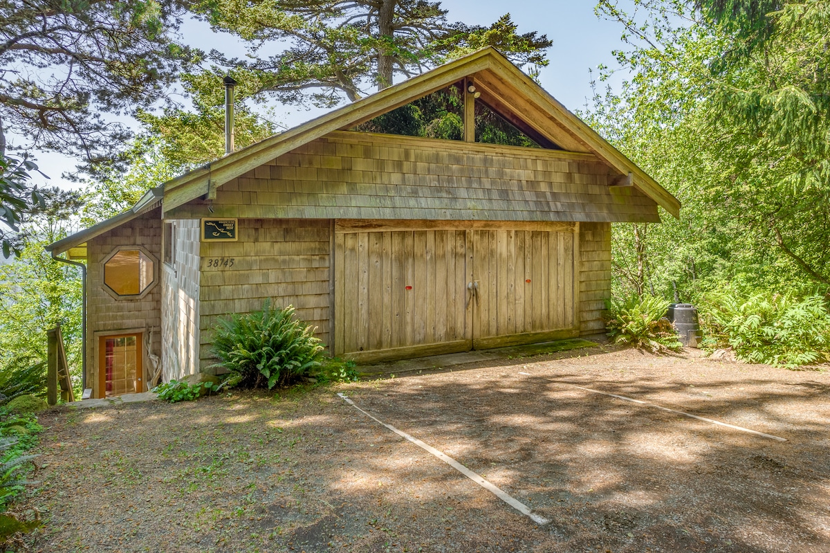 300 feet above the ocean on sacred Neahkahnie Mountain, 30 feet above the ground. Built by hand with love in 1985. Look out thru giant Sitka spruce and Douglas fir, south & west to the ocean. Look up from the sleeping loft through a huge skylight to the night stars and moon. Leave urban culture behind. Retreat into a world where the rest of nature speaks loudly. Neahkahnie means "place of the spirits." All are welcome to find true peace & magic here.