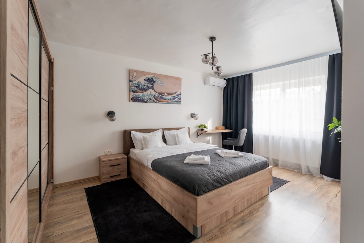 Silent Wave Apartment — a bright, modern studio perfect for active travelers and remote workers. Really close to Country Hospital and reasonable close to International Airport.Enjoy a cozy double bed, warm wood accents, natural light, and a stylish wave artwork that sets the vibe. With a sleek workspace, AC, and minimalist décor, it’s the ideal spot to relax, recharge, and enjoy a quiet, well-designed space.