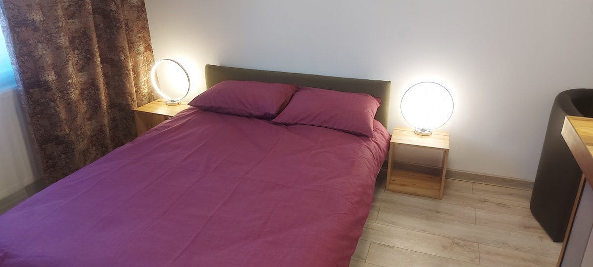 The Modern & Cozy two-room apartment comes fully equipped with everything a traveler needs. Located 3.5 km from the city center, has secured private parking, is a few minutes walking distance from big supermarkets, small neighborhood shops, organic market, the football stadium "Dan Păltinișanu", the municipal hospital "Spitalul Județean". Also within walking distance, you can find a McDonald's, ATMs, gyms, swimming pools, parks, and some of the most popular night clubs in the city.