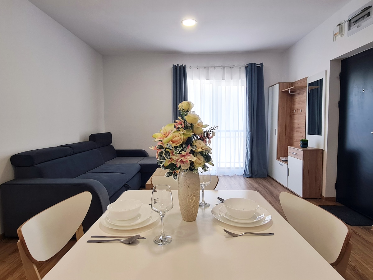 Apartament nou, luminos, cu design modern și parcare gratuită. Se poziționează la intrarea în Timișoara, în vecinătatea benzinăriei Esso. Apartamentul este dotat cu: -bucătărie complet utilată cu cele necesare: plită electrică, cuptor, mașină de spălat vase, frigider, aparat de cafea și veselă. -sufragerie open space în care oaspeții se pot bucura de un film, pe o canapea confortabilă, la un televizor Smart -dormitor cu pat matrimonial -baie cu cabină de duș și mașină de spălat rufe cu uscător.