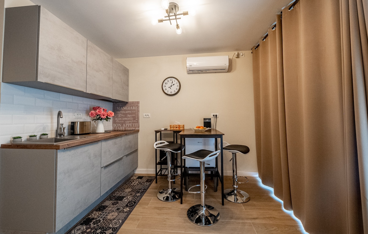 Selah's Tiny Home is a wooden house, build in 2025, especially for guests to feel cozy and at home. It's made in collaboration with Kenosis Design, company of high end furniture brand. It is 15 minutes away from the airport. Located in Giarmata, 11 km to Timişoara. It has a private courtyard. The inside is made with elements of wood and rock, well suited for a whole family to stay for as long as they want, because everything you need, is there ! So, come and rejoice in Selah's Tiny House
