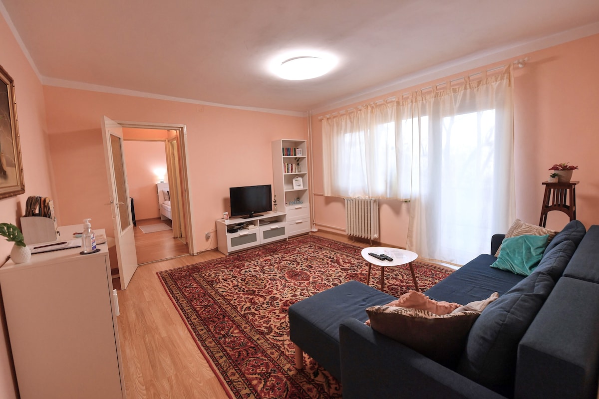 Apartment with terrace and forest view with free bikes! A specially arranged place, meant to bring you peace of mind. It is located 7 minutes from Iulius Town, the largest complex of shops and offices in western Romania, 15 minutes from the Timisoara Old Town. 2 minutes away from supermarkets, restaurants and cafes. The generous terrace offers you a wonderful view of the starry sky and the forest, where you can make a barbecue or drink your coffee in the morning with the birds chirping.