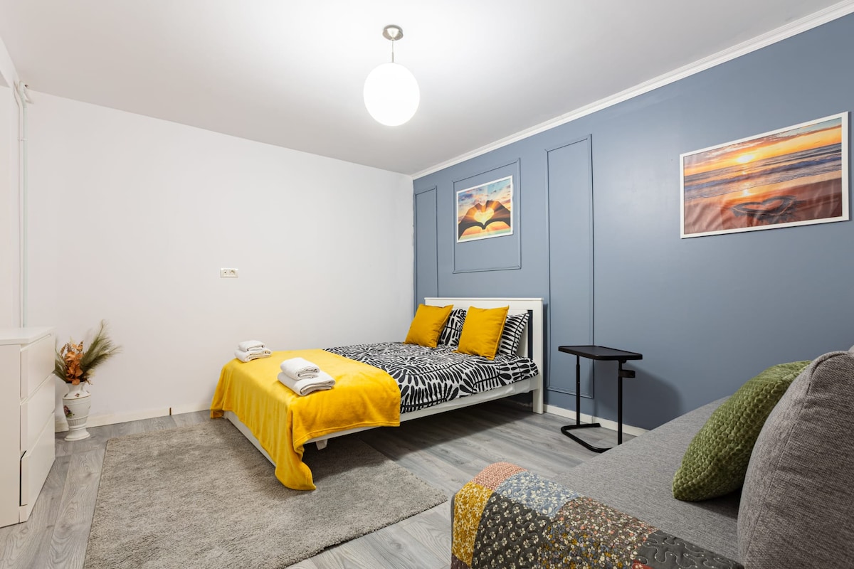 Apartamentul este situat aproape de centru si iulius mall, facultatea de medicina ,o zona linistita de case . nou renovat ,parter , - Parcare gratuită pe stradă - pat dublu -clima -masina de spalat -uscator de haine electric -fier de calcat haine -frigider - smart tv, cablu tv ,Netflix -internet -chicineta ,dotata ( vesela ,cafetiera , plita pe inductie.) -incalzire colterm (reteaua se stat). -baie cu dus se asigura lenjerie , hartie igienica ,sampon ,sapun. -sunt acceptate animale de companie