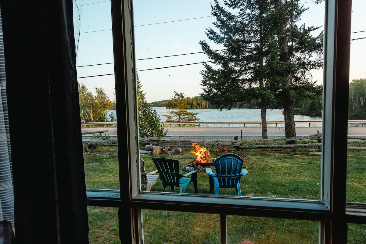 Escape to Lake! Our rustic heated cabin on Lake Temiskaming offers cozy retreat and spectacular sunsets. Relax by the beach, roast marshmallows in fire pit or drift to sleep to the sounds of the waves. Enjoy post-hike drinks by the lake or in the cozy bar and outdoor living room. Cook with a BBQ (propane incl.), microwave, and stove. Wash off the trail or start/end your day with a hot shower. Sleeps 2 on the main floor and 1-2 in the low-clearance loft. Pool and dock currently closed.