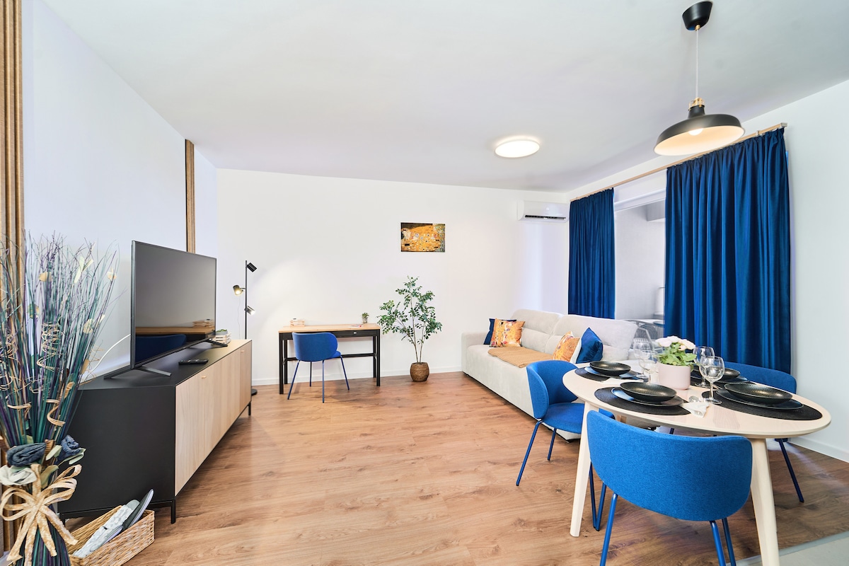 Apartament 2 camere| Central | Concept unic cu spațiu de relaxare & mini sală de fitness Perfect pentru cupluri, călătorii de business sau turiști care caută o cazare modernă, acest apartament combină eleganța, funcționalitatea și poziția excelentă, oferindu-ți un sejur relaxant și plin de confort. Dotări principale - dormitor cu pat matrimonial - living spațios cu Smart TV și zona de dining - bucătărie complet utilată - baie elegantă - locație centrală - loc de parcare + wifi gratuit