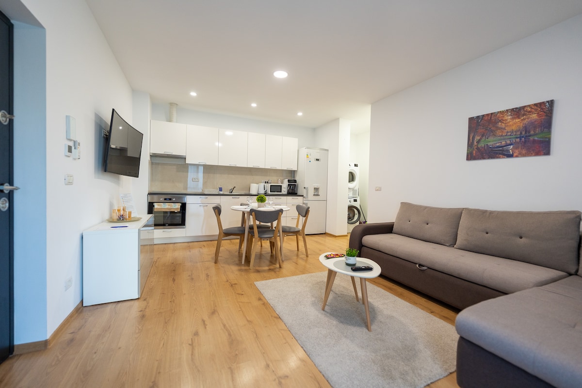 Welcome to your cozy getaway! Kick back and relax in this calm, stylish studio. My charming apartment features a comfortable 180x200 cm bed and is perfectly situated just 400 meters from the Iulius Town (5 minutes by foot) and 1km away from the historical and cultural city center. Iulius Town is the busiest place in the city. Here, you can find any restaurant you want, any café you like, and any store you want to shop in. It's really the place near you want to stay when you come to Timisoara