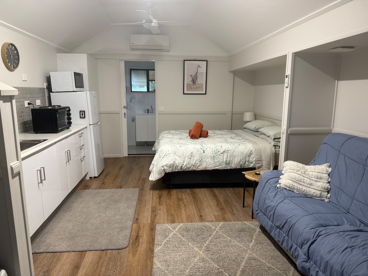 Escape to tranquility in our newly renovated, fully self-contained guest house, offering modern comfort while retaining its rustic charm. Our one-bedroom guest house includes a queen bed, with an additional queen size Koala pullout sofa in the living room for any additional quests. We are nestled on a serene 400-acre cattle property just 7 minutes from Atherton. Our guesthouse is detached from the back of the main farmhouse, with a shared yard. Close proximity to local attractions.