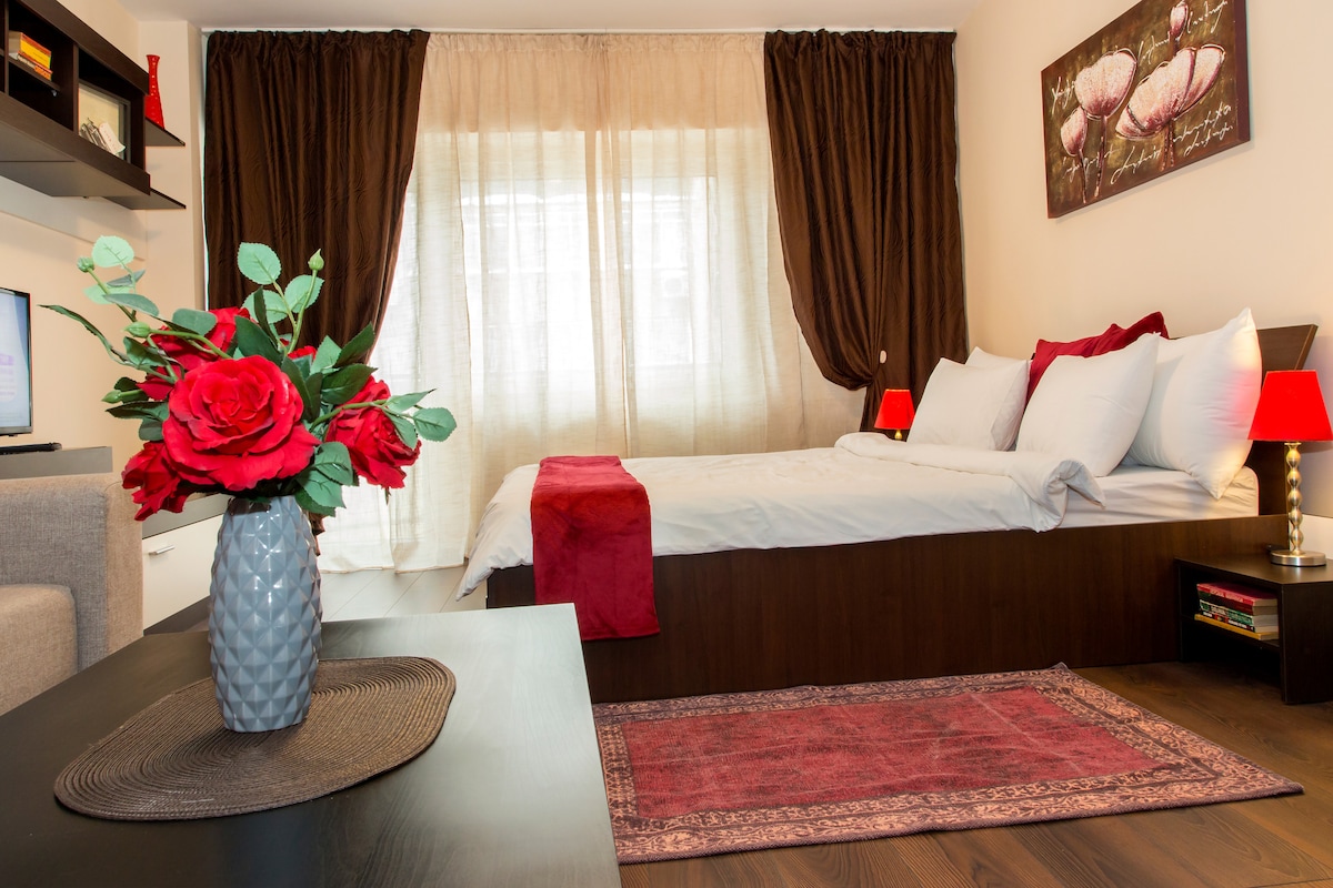 Spacious luxury 40 sqm studio in the heart of Bucharest, just steps from Old Town Bucharest. Recently renovated, the apartment features elegant decor, a comfortable queen-size bed (180×200 cm), a stylish sofa, a cozy balcony, a large fully equipped kitchen and a spacious bathroom with rain shower. Hosted by a Superhost with over 7 years of experience. Metro right next to the building. Coffee shop, cake shop, mini markets, fast food, ATM and currency exchange on the ground floor.