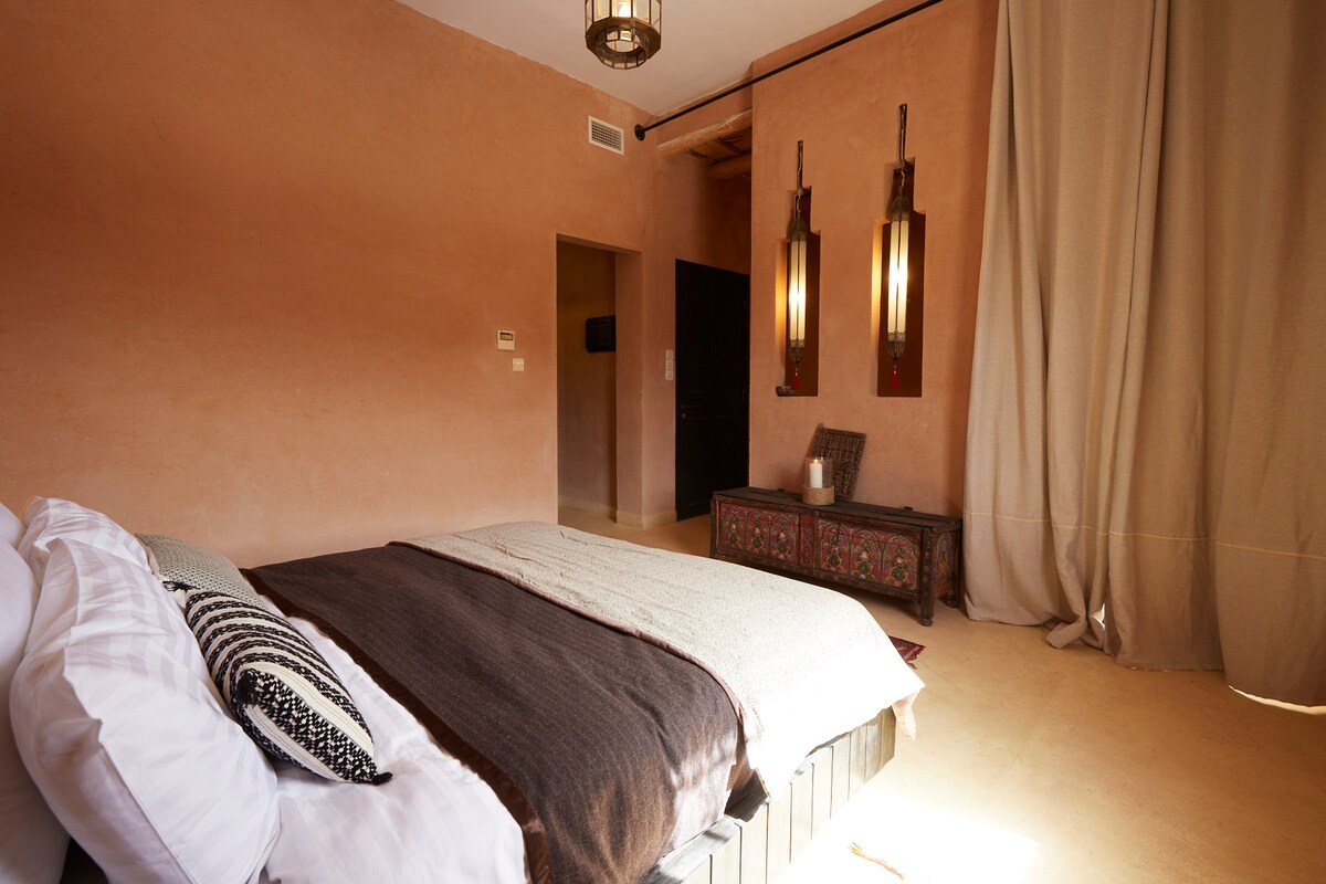 Escape to our luxurious ecolodge nestled in the heart of Roses Valley, Dades Gorge, where a stay with a local family promises an immersive cultural experience amidst our 600 square meter aromatic organic food garden. Indulge in unique local cuisine crafted from garden-fresh ingredients, while surrounded by artistic touches and unparalleled hospitality. Embrace the tranquility of the valley, as each moment becomes a cherished memory in this oasis of comfort, sustainability. Double/Twin rooms