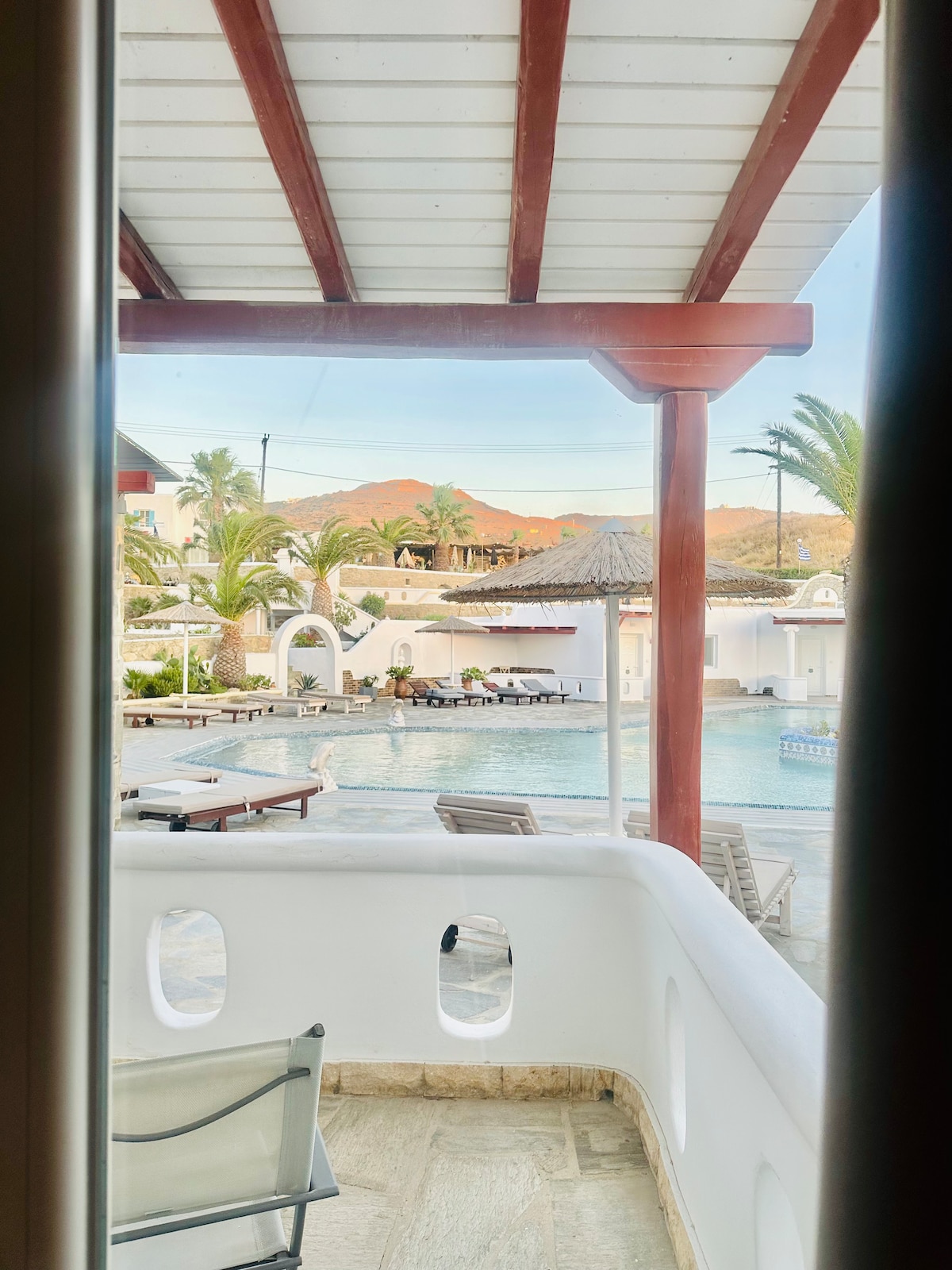 Two self-serviced, cozy, interconnected en-suite guest rooms with a shared kitchenette (fridge & 2 hobs) and a sunny veranda overlooking the sparkling blue waters of Platis Gialos. Just 130m from the beach and a 10’ stroll to Scorpios and local tavernas. Perfect for a carefree, car-free stay with easy access to buses to Mykonos Town and sea buses that whisk you to the island’s popular beaches and vibrant beach clubs.