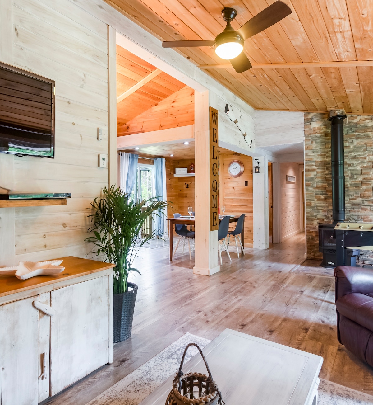 Escape to a serene lakeside retreat this summer. From your private dock, take in the beauty of the vibrant nature wonderland. When evening falls, unwind in the hot tub with stunning views, gather around the fire pit for s’mores and stargazing 🌌, or cozy up by the fireplace with a warm cozy drink ☕ Book your unforgettable waterfront cottage retreat now! 🏡✨