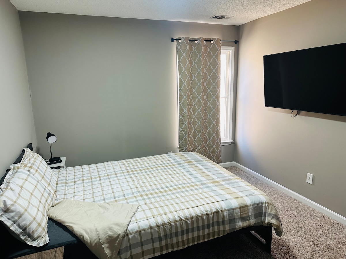 This wonderful cozy studio is super private, with its own entrance right on the side of the house. Plus, it comes with a full kitchen and bathroom. It’s a peaceful, private space with a well-equipped kitchen featuring a big refrigerator, a queen-size bed, a 45” smart TV, a private entrance, an outdoor deck that leads to the backyard, and parking right next to the unit. We’re just a 30-minute drive to downtown Atlanta, Mercedes-Benz Stadium, the GA Aquarium, and 15 minutes to Gas South Arena.