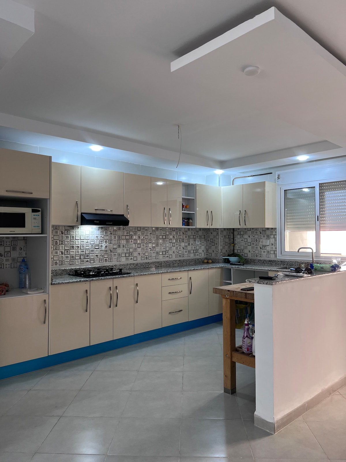 Location pour vacance d'un appartement neuf au premier étage de 90 m2 avec chambre à coucher, un grand salon ouvert sur la cuisine, disposant de tout l'équipement nécessaire, eau chaude et froide 24/24 h, salle de bain, cuisine équipé d'un réfrigérateur brandt 440 l, machine à laver brandt 10 kg, l'appartement peut accueillir un couple dans la chambre à coucher et trois personnes dans le salon marocain de 30 m2 avec téléviseur stream de 55 cm, parking gratuit.