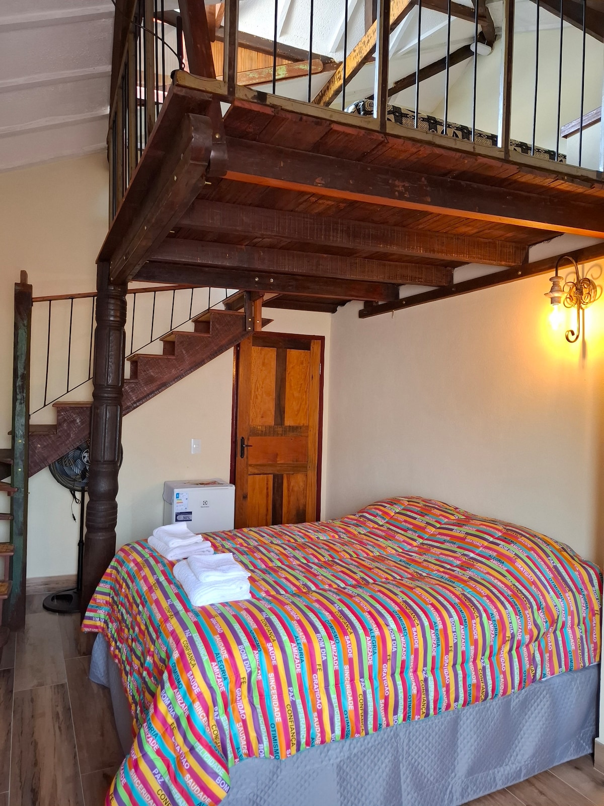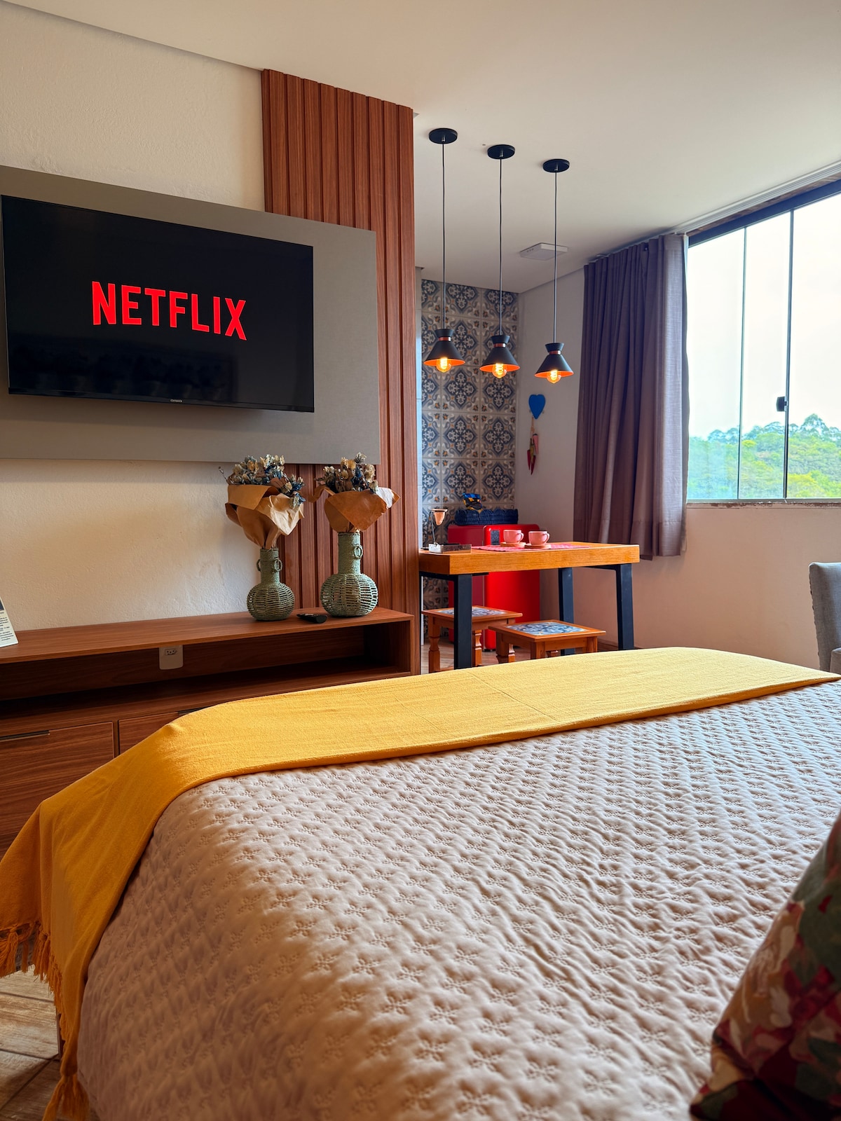 Bem-vindo ao nosso recém inaugurado mini-loft! Localizado no @espaçonossatiradentes, esse quarto conta com: - Cama casal; - Fogão de indução; - Frigobar - Utensílios de cozinha; - Armário para roupas; - Ar Condicionado; - WI-FI - Televisão com SKY+ incluída. Um design aconchegante, pensado para um casal curtir Tiradentes sem preocupações. Além disso, temos uma vista linda para a Serra. A suíte está no 1o andar do Espaço, localizado a 800 metros da praça principal da cidade, em linha reta.