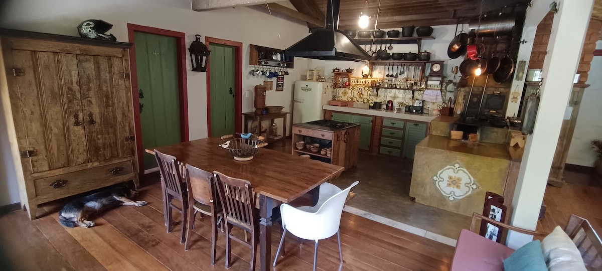 🌿Casa Colonial ao pé da Serra de São José 1800m (5 min de carro) do Centro Ideal para casais e pequenas famílias. 2 quartos aconchegantes de casal (1 suíte) Banheiro social Cozinha equipada com fogão industrial em ilha, Fogão a lenha Lareira Smart TV Wi-Fi rápido Máquina de lavar e secadora Churrasqueira fogo de chão Chuveirão externo Riacho particular Estacionamento privativo Hortinha orgânica Venha viver a verdadeira Tiradentes na Casa do Riacho. Superhost com 5 estrelas consistentes.