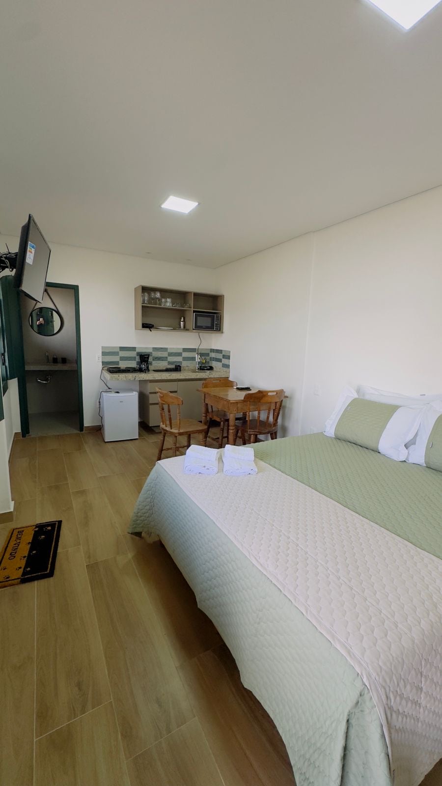 Flats bem decorados com roupa de cama e banho. De uso comum ( piscina, jardim e estacionamento gratuito). Café da manhã, sob consulta e pagos à parte. Todos os flats: cama casal Queen com colchão de molas, camas de solteiro, geladeira ou frigobar, fogão, tvs com canais abertos, utensílios de cozinha, cafeteira, ventilador de teto, closet. Banheiros com bancada e água quente na pia, ducha higiênica, blindex e sistema central de água quente. Aceita animais de estimação sob consulta e taxas!