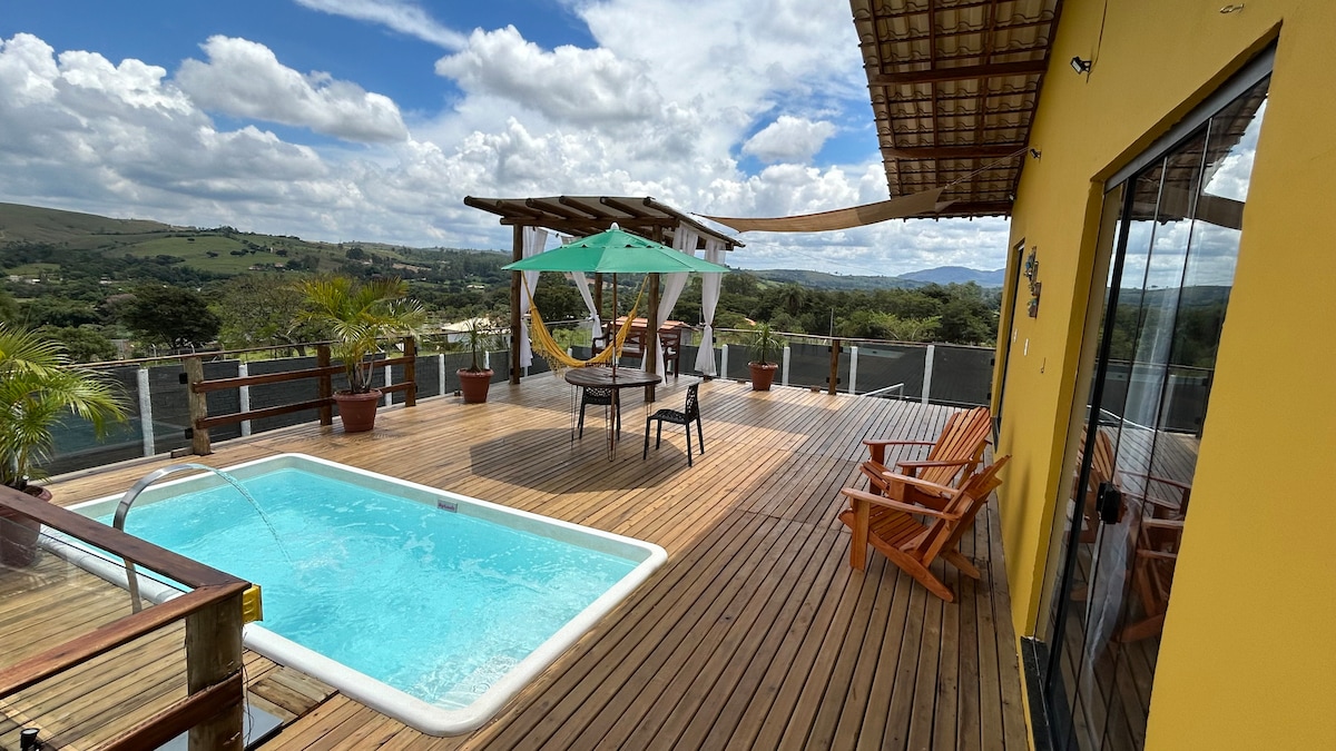 Relaxe neste espaço calmo e cheio de estilo. Nossa acomodação é especial, tentamos fazer um espaço romântico e aconchegante para nossos hóspedes. É decorado com produtos locais. As luminárias usadas na decoração, as mesas laterais, mesa da cozinha, são de fabricação nossa. É uma acomodação mais moderna e ao mesmo tempo, com toques rústicos e bem Mineiros. Temos um deck de madeira, com cadeiras, onde nossos hóspedes podem contemplar a linda serra de São José e até mesmo tomar um bom vinho.