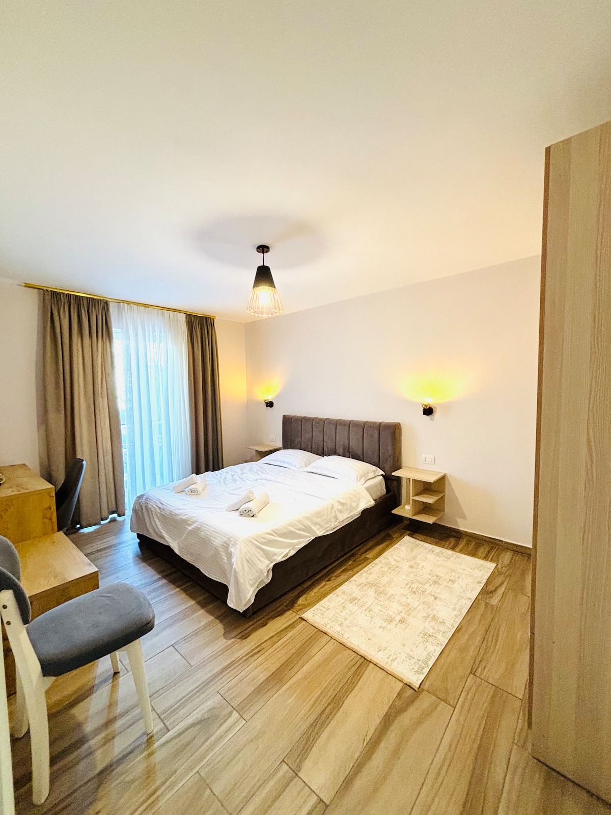 Dive in the elegance and luxury of this apartment. A unique and spacious place for everyone looking for a magic stay in Tirana. With an amazing location, just 800m from the center of the city and a 37 min drive from the airport, this apartment is the right place to spend your days and nights. Save this place for a special date. Enjoy your stay at Sia's Apartment!