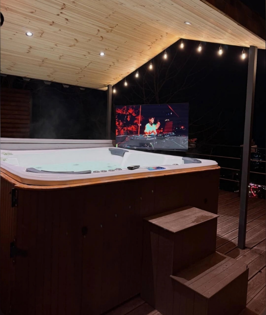 It is a wooden villa with two floors, two bedrooms with double beds each, two toilets, 1 sofa bed, outdoor dining area, barbecue area, outside hot tub.