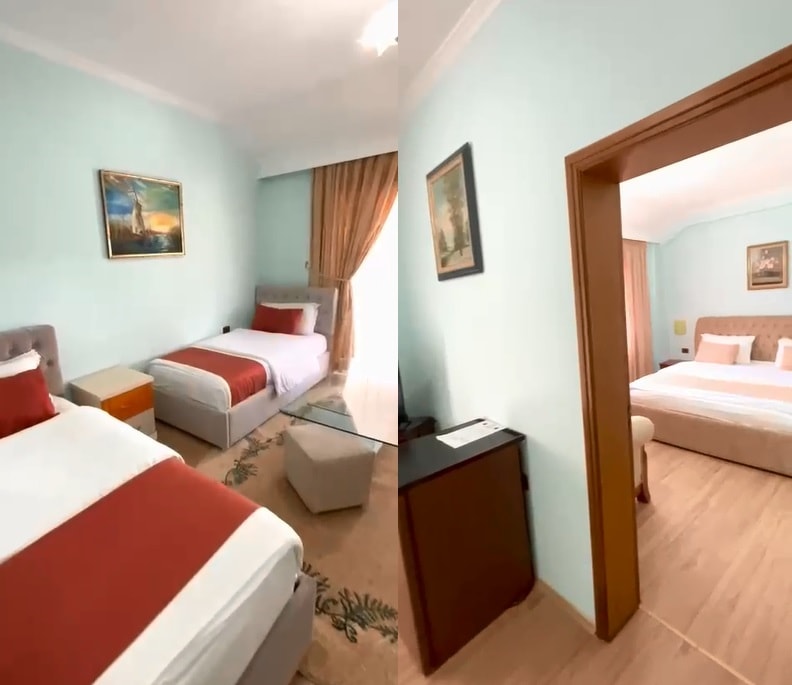 Introducing our luxurious hotel room 201, located 2 min away from the old bazaar of Kruja and the city center. Situated on the 3rd floor, this modern oasis boasts a jacuzzi and breathtaking city views. Enjoy the area with an open wardrobe and a Smart TV with Netflix for your entertainment needs. You'll find yourself just minutes away from the historic Kruja Castle and surrounded by a plethora of dining options, cafes, shops, ATMs, bakeries, currency exchange services, pharmacies, souvenir shops.