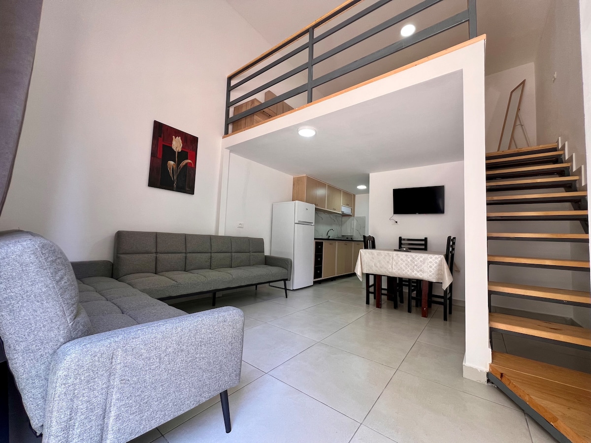 Stylish Loft Apartment with Mezzanine Bedroom Modern loft with mezzanine bedroom overlooking the living area. Located on the first floor, it offers natural light, a fully equipped kitchen, and a cozy atmosphere. Ideal for couples or solo travelers. Host: We live in the same building, one level up. Location: Only 10 minutes’ walk from Skanderbeg Square, close to the city center.