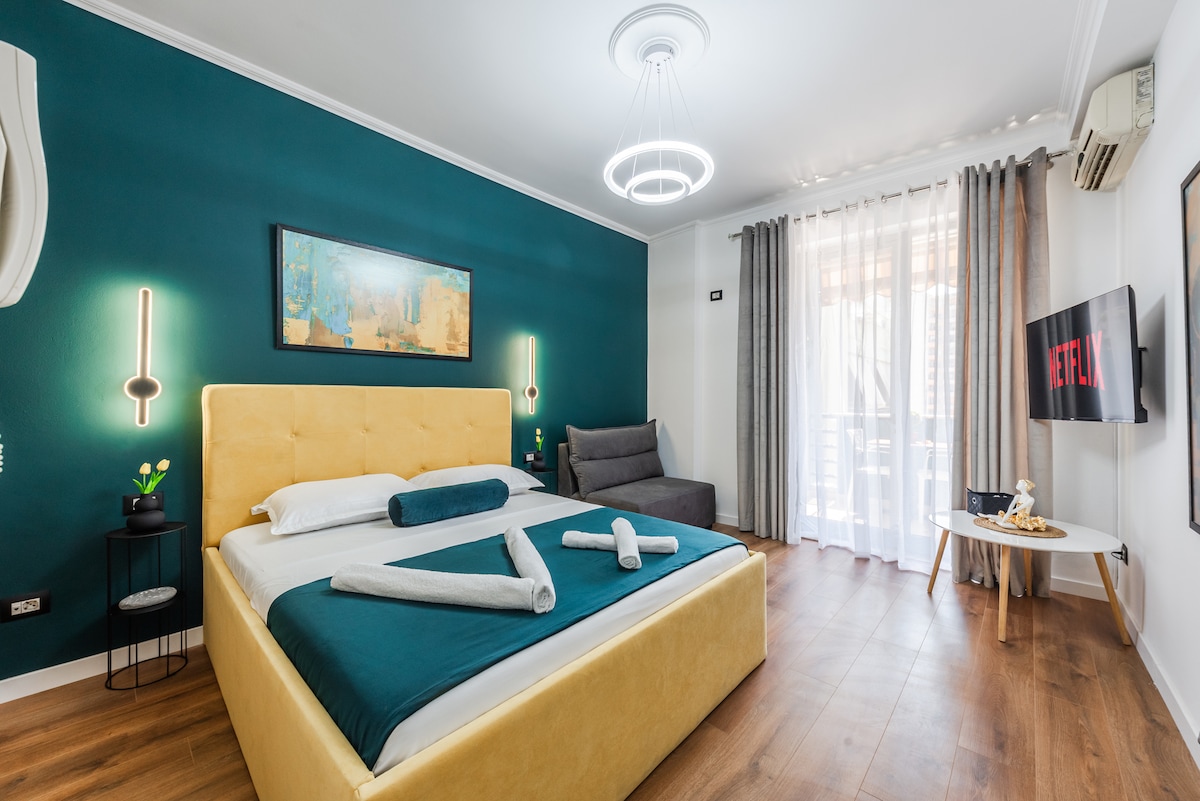 100 m² designer 3-bedroom in Tirana’s prime center, steps from Skanderbeg Square and the New Bazaar. Walls dressed in refined wallpapers, two stylish bathrooms, and hotel-quality beds with custom mattresses for deep sleep. Enjoy two balconies for morning coffee or sunset drinks. Fully equipped kitchen, fast Wi-Fi and A/C throughout. Ideal for families, friends or business stays seeking space, comfort and quiet elegance.