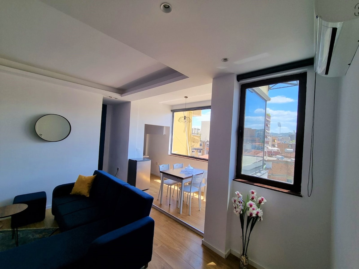 This bright studio in the city center sits on the top floors of a building overlooking the Grand Boulevard garden and Presidential Palace. The apartment includes: - Access Code - free WiFi - A/C - smart TV - private bathroom and shower - kitchen appliances - bed linen, and towels A minimarket is on-site. Steps from: - Skanderbeg Square - Tirana Lake - Stadium - Restaurants - Boutiques - Popular points of interest - Nightlife - Public transport and taxis