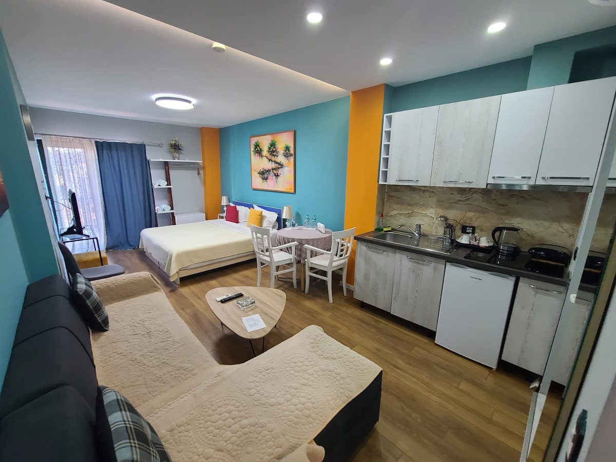⚠️ IMPORTANT: This listing is for ONE studio ONLY, NOT two bedrooms. Ask before to specify which studio is available. Stay steps from Skanderbeg Square in a 100% brand-new, high-end studio or suite. 1- Modern Studio 35 m² (private bath, NO bathtub) OR 2- Luxury Suite 48 m² with bathtub. Fully equipped kitchen, dining/work space, premium parquet, LED & spot lighting, Venetian walls and floor-to-ceiling glas Walk to everything. Hotel-level comfort. Book now. IDEAL FOR COUPLES(2)orSOLO travelers.