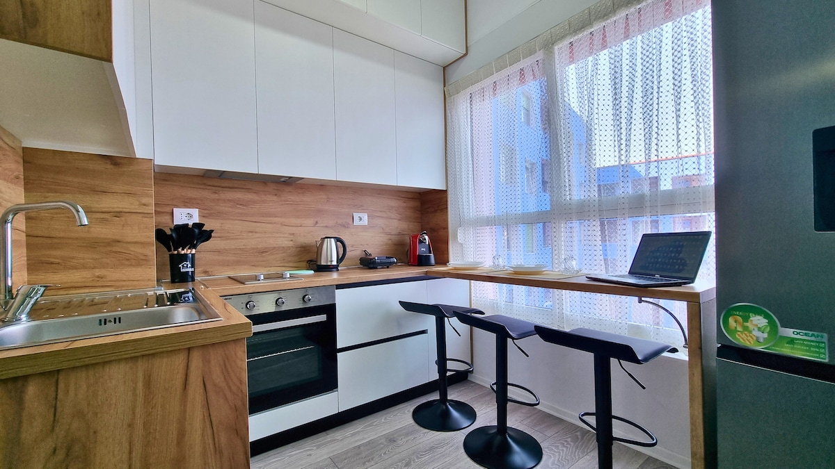 Luxury Apartment near New Bazaar – Tirana Stay in style at this elegant apartment just steps from the New Bazaar. Enjoy modern design, a bright living room, a king-size bed, a fully equipped kitchen, and a private balcony. Includes free parking, high-speed Wi-Fi, Smart TV, and air conditioning. Perfect location — walk to cafés, restaurants, and Tirana’s vibrant center.