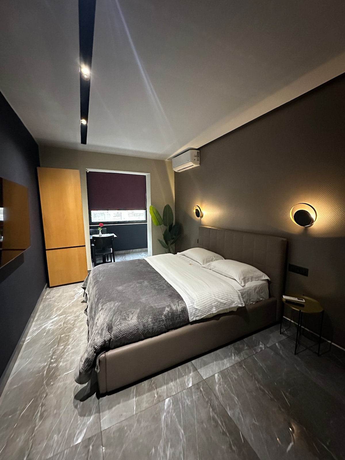 The apartment is situated 400 meters from Skanderbeg Square and features a living room with a flat-screen TV, a well-equipped kitchen with a dining area, a fridge, an oven, a microwave oven, a washing machine, a bathroom, and a large balcony. The bathroom is fitted with a tube, a bidet, free toiletries, a hair dryer and bathrobes. WiFi is available throughout the property and air-conditioning is available on living room and bedroom. One extra single portable bad available in the apartment.
