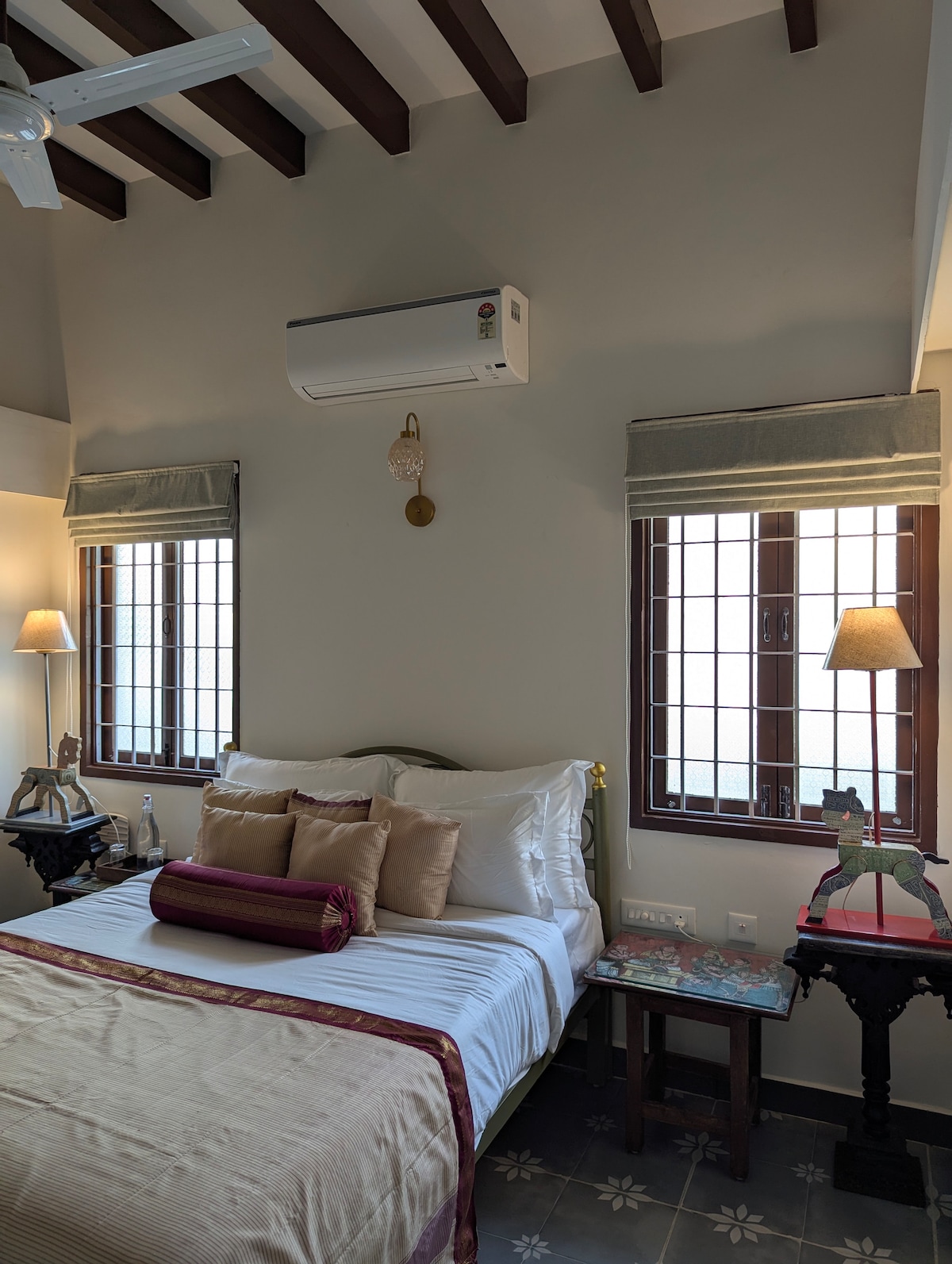 The Kittu Suite is a vibrant space with a striking red colour palette. It features a dressing area with a life-size mirror bordered by an old wedding saree. The room is also decorated with framed vintage calendar prints of gods and goddesses. Beautiful repurposed horse toys from Mysore serve as lamp bases in the bedroom, while the bathroom offers a contrasting green oxidized wall. BREAKFAST is included.