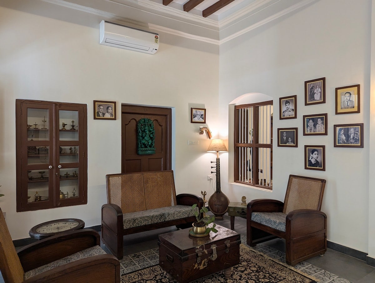 This beautifully restored 6-bedroom heritage home with a pool, in the heart of Trichy is a living testament to a family's cherished memories. It has seen many lives—from a bustling family home to a popular wedding hall—and now stands as a loving tribute to its past, blending its rich history with the city's lively energy. Blending historic elegance and modern comforts, it offers an authentic and deeply satisfying stay. BREAKFAST is included in the stay.