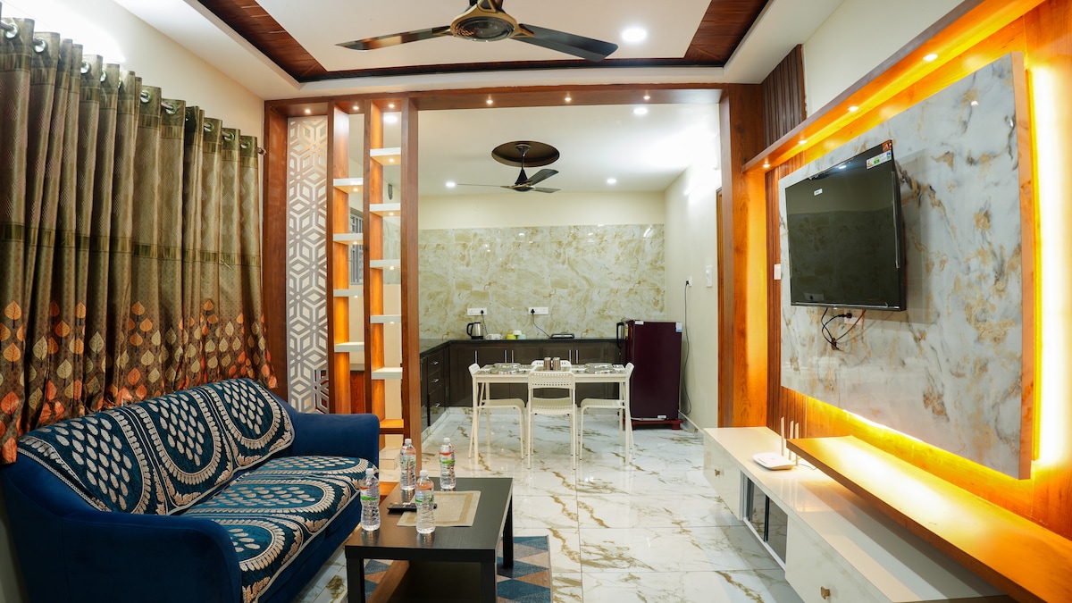 A family and women-run business, part of the popular Tirupati Homestays brand powered by Stayflexi. Stay with us at our brand new, luxurious 3 BHK, air-conditioned homestay in a prime location. Our spacious apartments offer a large living and dining area, as well as comfortable bedrooms. We are conveniently located near restaurants, cafes, and a supermarket and are easily accessible from the airport and major highways. Come and enjoy a fun-filled stay with us.