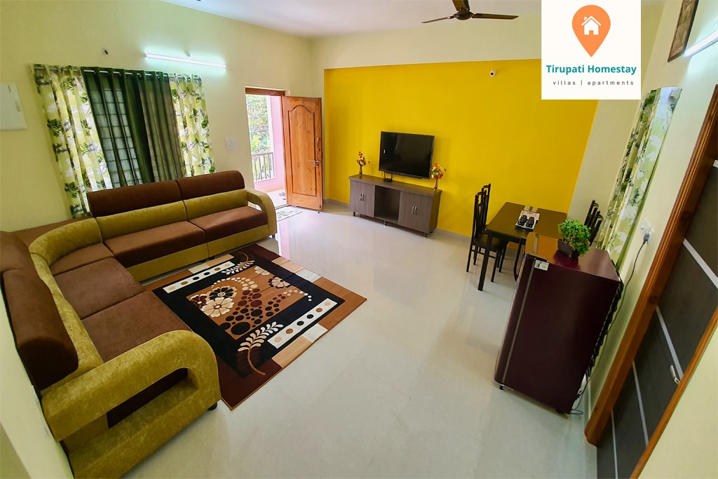"Only for families.This is a 1BHK Apartment with excellent view of Ramanuja circle/Tirupati & the Hills. Ideal for a Small Family. Living Room has two Diwans and a Sofa set. Kitchen with Gas & all other basic utensils for cooking is available as a part of the Living Room. There are two Washrooms - one attached to the bed-room & the other is a accessible from the Living room. Neat & Clean/Fully Sanitized.