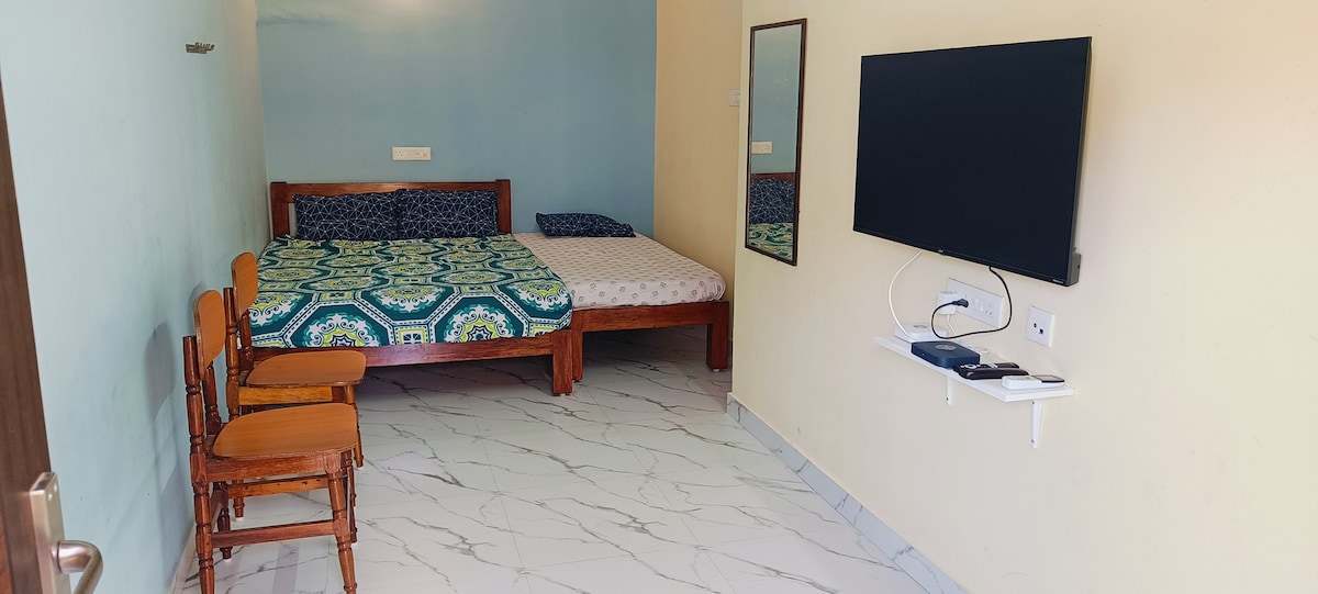 Premium Rooms are Very Spacious constructed with 225 SQ Feet , has a Bedroom with attached Bathroom , Bedroom has Two Queen Bed and Additionally Two Extrabeds can be Laid Comfortably. All Room has Split Aircondition , A Huge Window is Fixed in all Rooms where you can see a Mountain view of Tiruvannamalai . 43 Inch SMART LED TV With Cable Channel also Management allow OTT With Guest Subscriptions. Free WIFI With Inverter Provisions which helps during Power Failure.