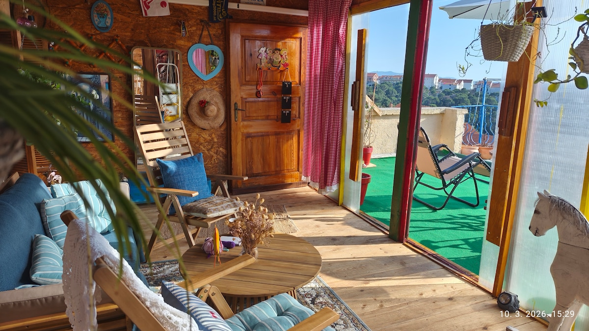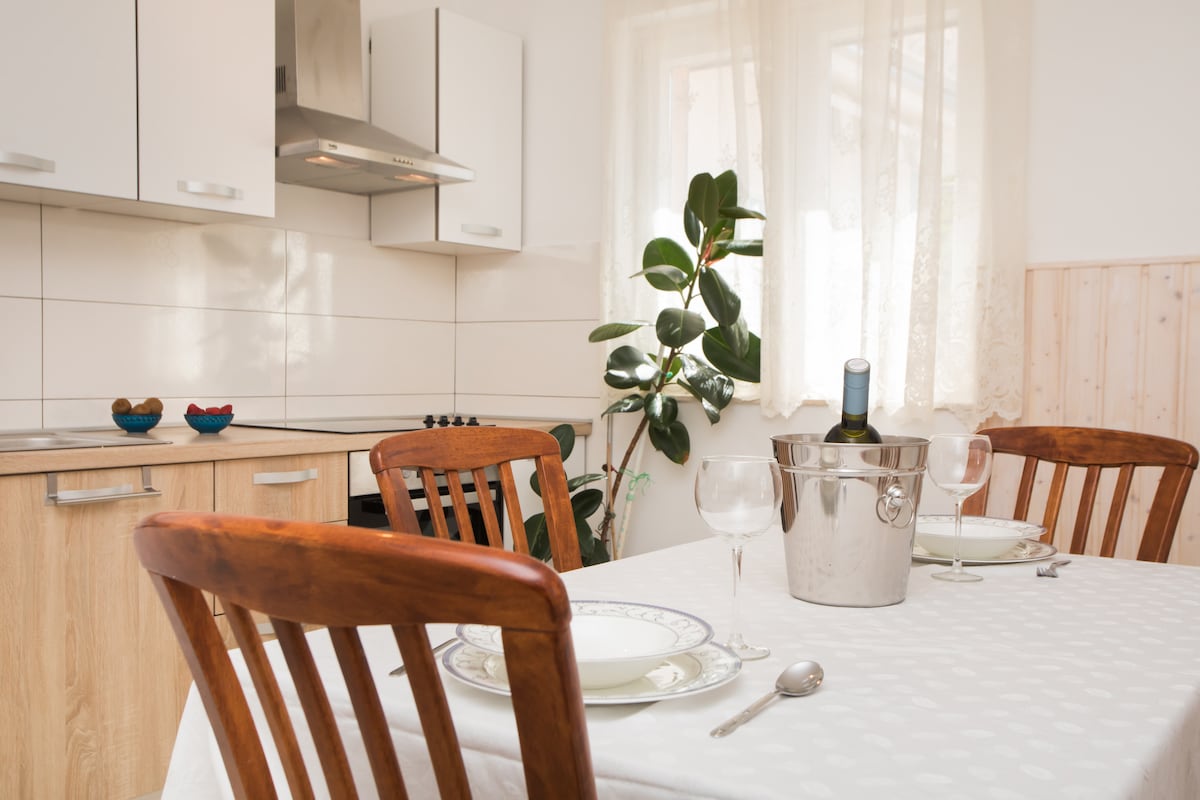 Forget your worries in this spacious and serene space. The apartment consists of a bedroom with a king size bed, one bathroom, living and dining area and a kitchen. In addition it has a very spacious terrace and is equipped with AC, Wi-Fi, satelite dish, TV, coffe making facilities.. Free parking and free boat mooring is available per request. Pets are welcome. For any additional request we stand at your disposal.
