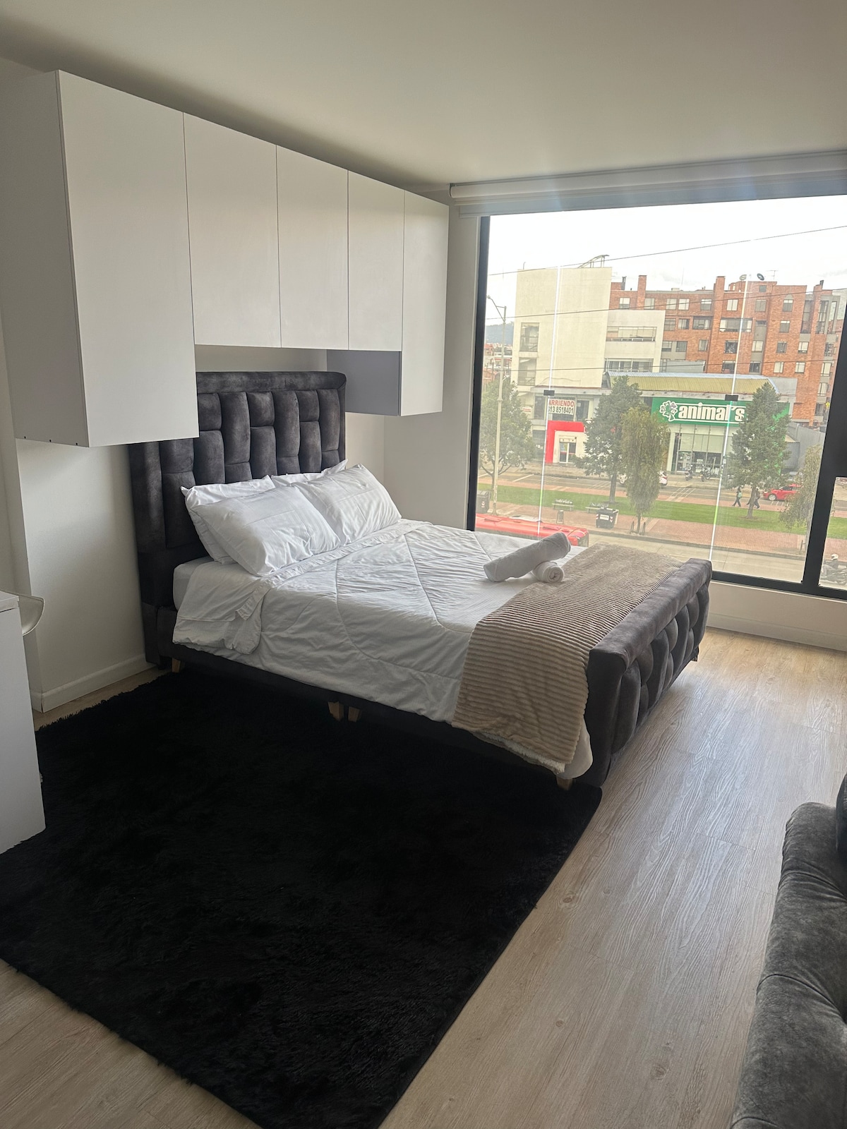 Located in the best area of Bogotá. ideal for business trips, leisure and small families that want to stay in a studio apartment. You will be in walking distance from three main shopping centers, top restaurants, gyms, supermarkets, bars, clubs, parks, coffe shops, hospitals and public trasnport stations in the city. This brand new studio apartament offers 24/7 doorman security a panoramic terrace on the building´s top floor, jacuzzi and front view to one of Bogota´s principal parks, el Virrey