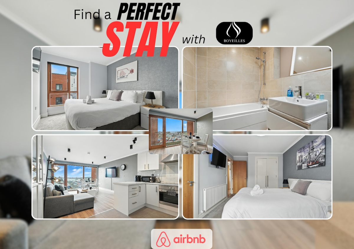 This modern, spacious 2 bedroom apartment has been designed for the Airbnb market. It is conveniently located right in the heart of Belfast only 500 meters from Lanyon Place Station. It is a ten minute walk from the Titanic Exhibition centre and only 5 minutes from dozens of popular restaurants and bars. The apartment also benefits from stunning views over the river Lagan on one side and Samson and Goliath the iconic cranes of the Harland and Wolf shipyard, on the other.