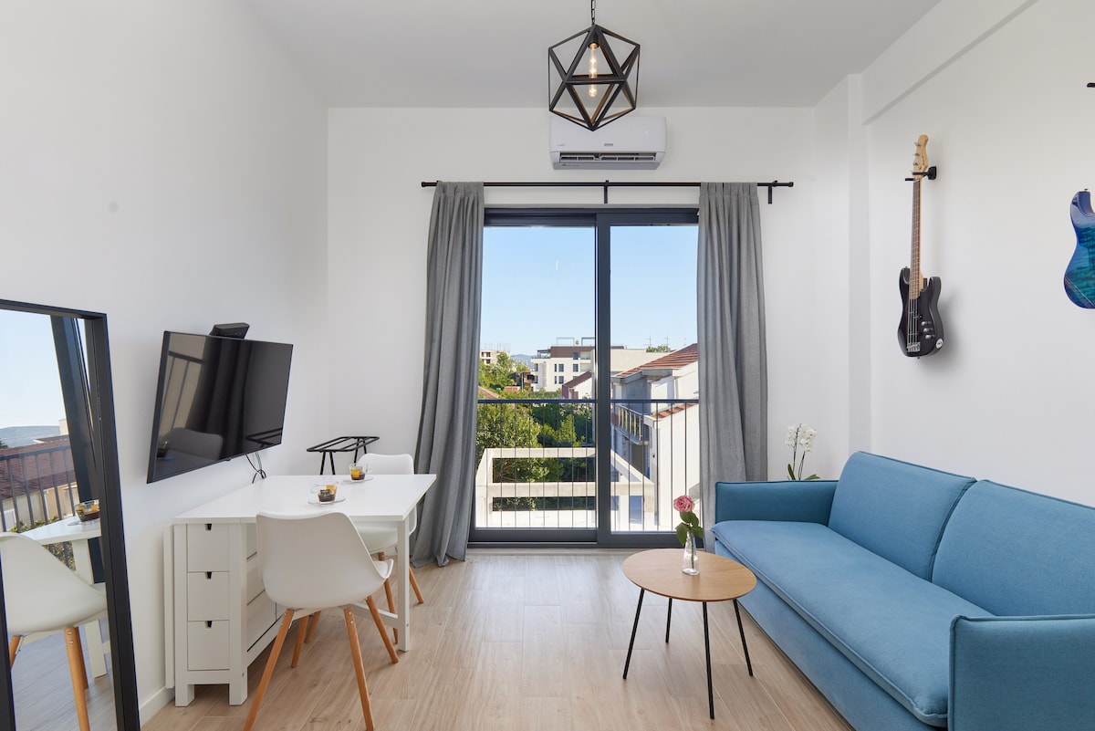 One bedroom fully furnished apartment ( 45m2) . 200m away from the sea, 150m from the center . The apartment include: air conditioning , wi- fi , cable TV, washing machines , toilet accessories, iron, hair dryer.Also the neighborhood is very quiet