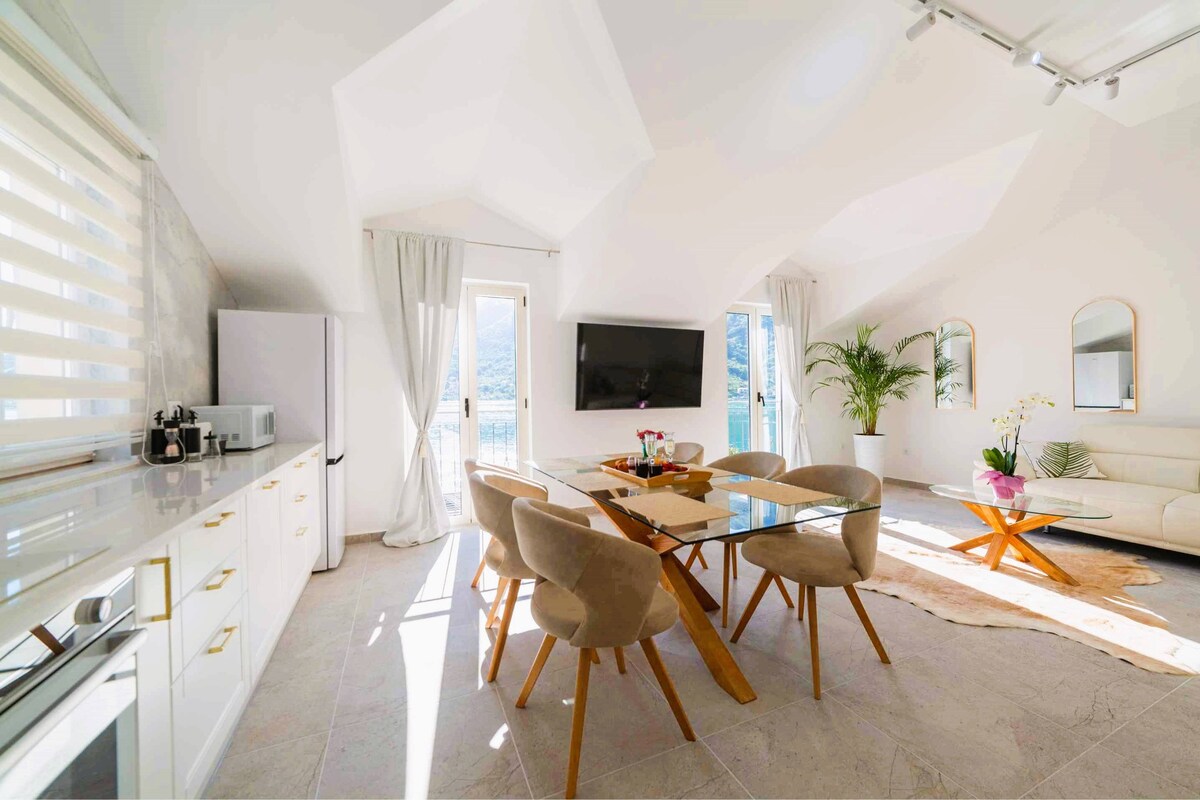 Stunning one-bedroom luxury apartment in Tivat, offering breathtaking sea views. Nestled in a prestigious location, this sophisticated residence combines modern design with premium comfort, making it the perfect retreat for those who appreciate style and serenity. The apartment is designed for couples and is the perfect space for that romantic getaway. Fully renovated open plan living/dining room and kitchen. Small double bedroom and adequate shower room.